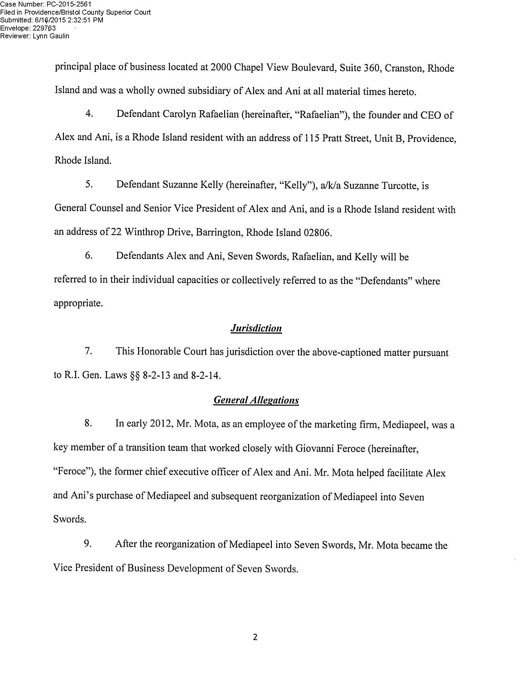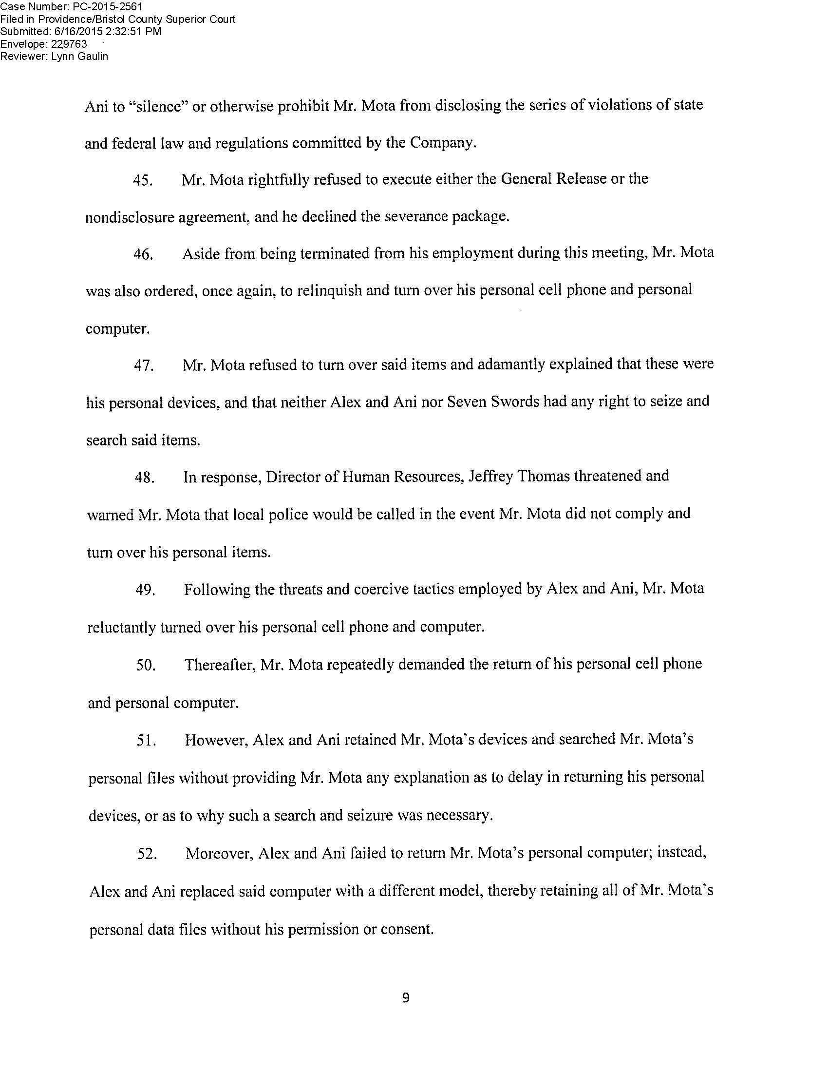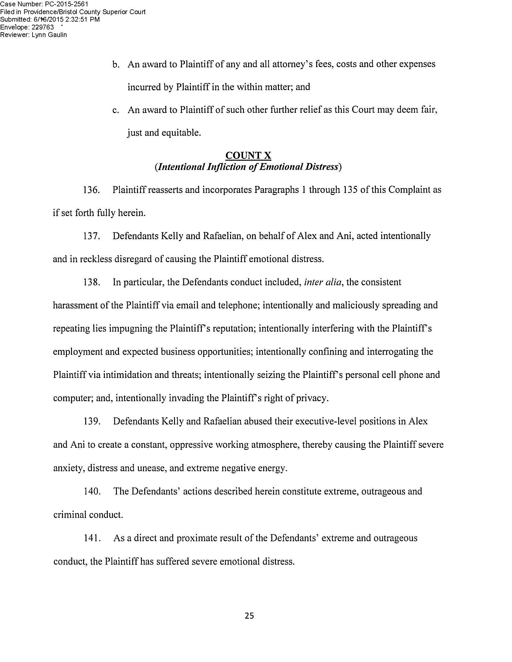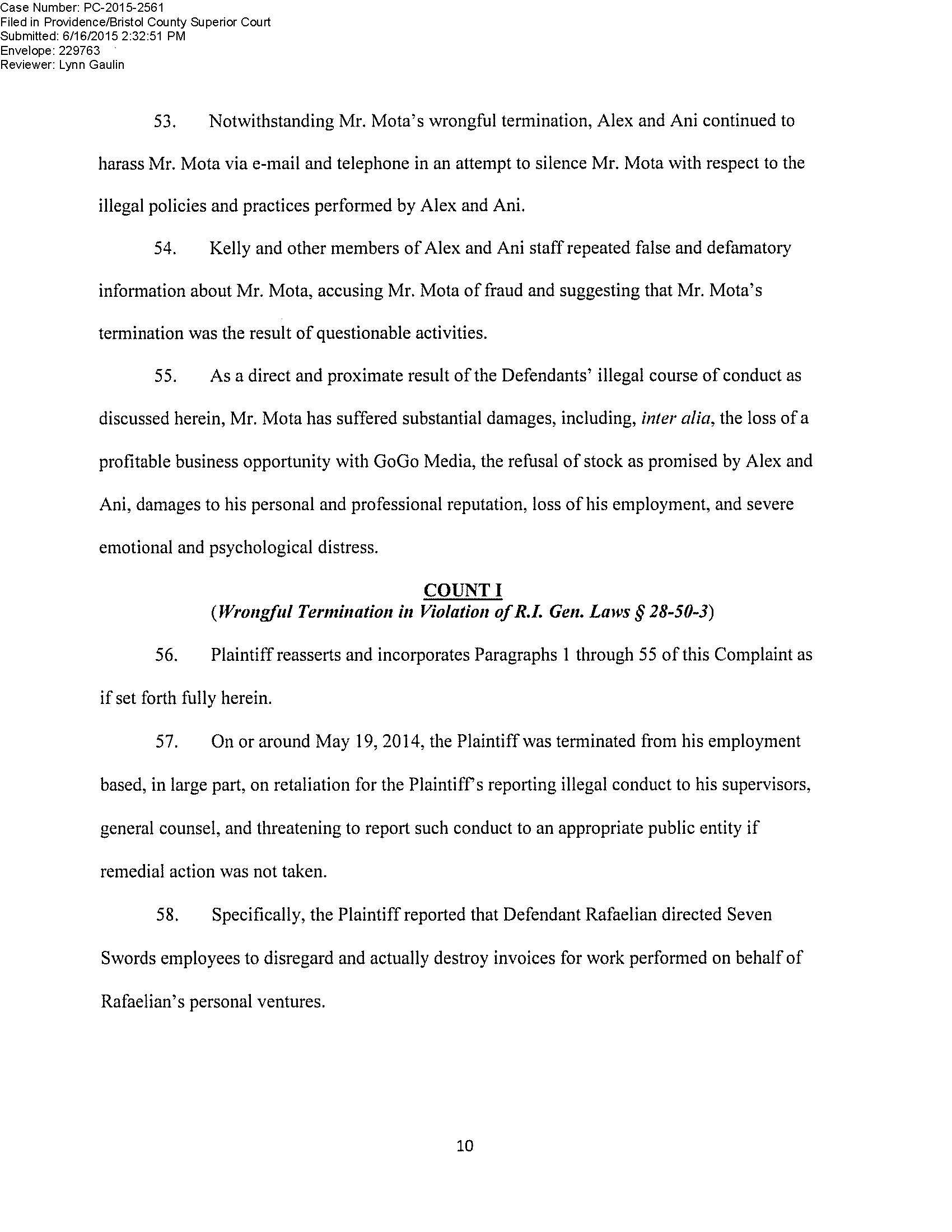 Of notable concern was the fact that Rafaelian directed Seven Swords employees to disregard or otherwise destroy invoices for work performed on behalf of Rafaelian’s personal ventures. Plaintiff had previously complained to Rafaelian, Feroce and David Rozen, CFO for Alex and Ani, that the provision of services by Seven Swords to Rafaelian for her personal benefit, without compensation to Seven Swords, was draining the finances and resources of Seven Swords.