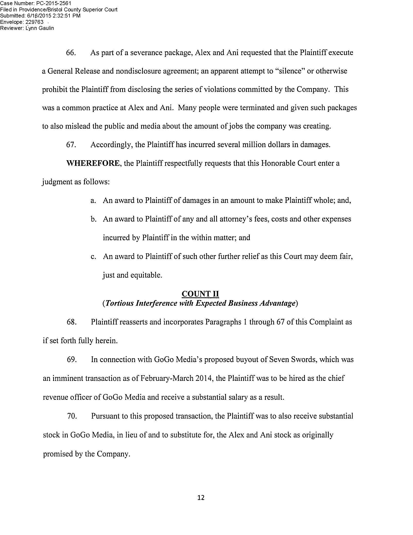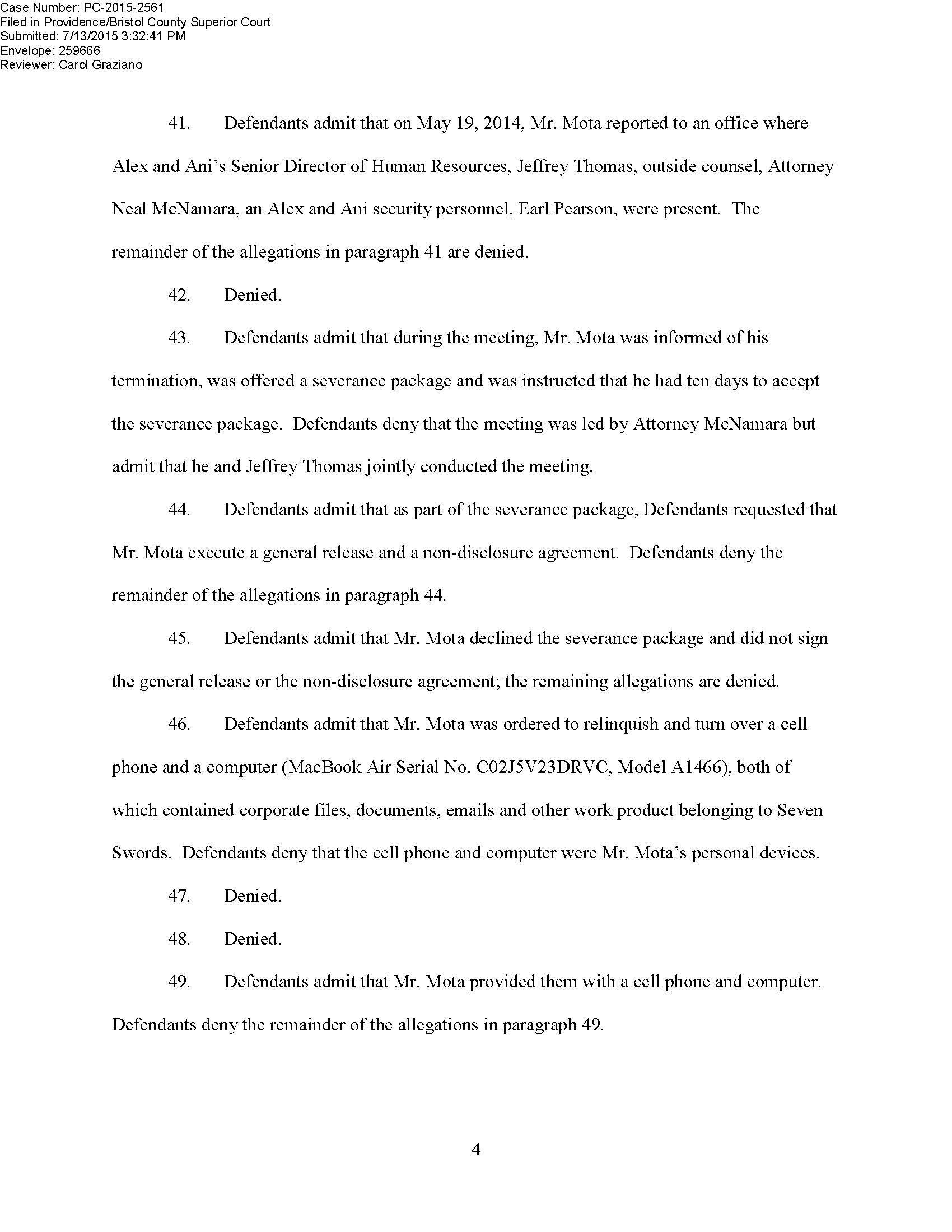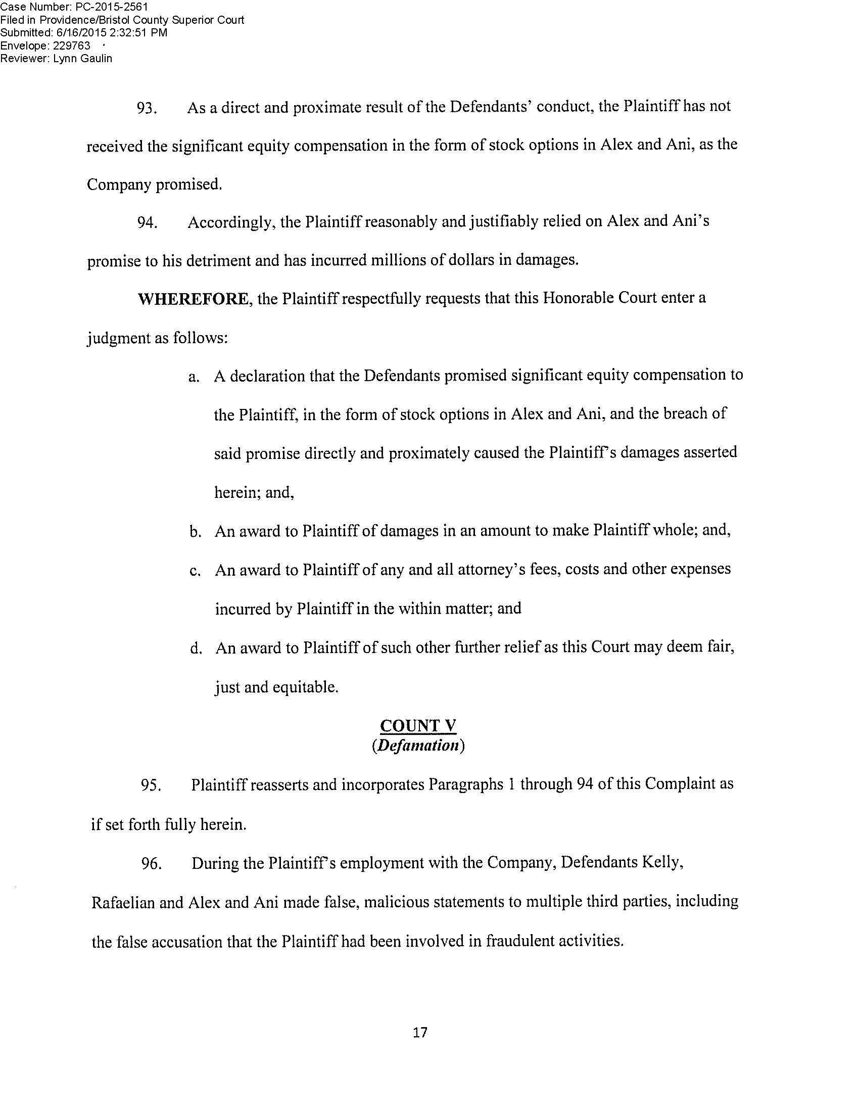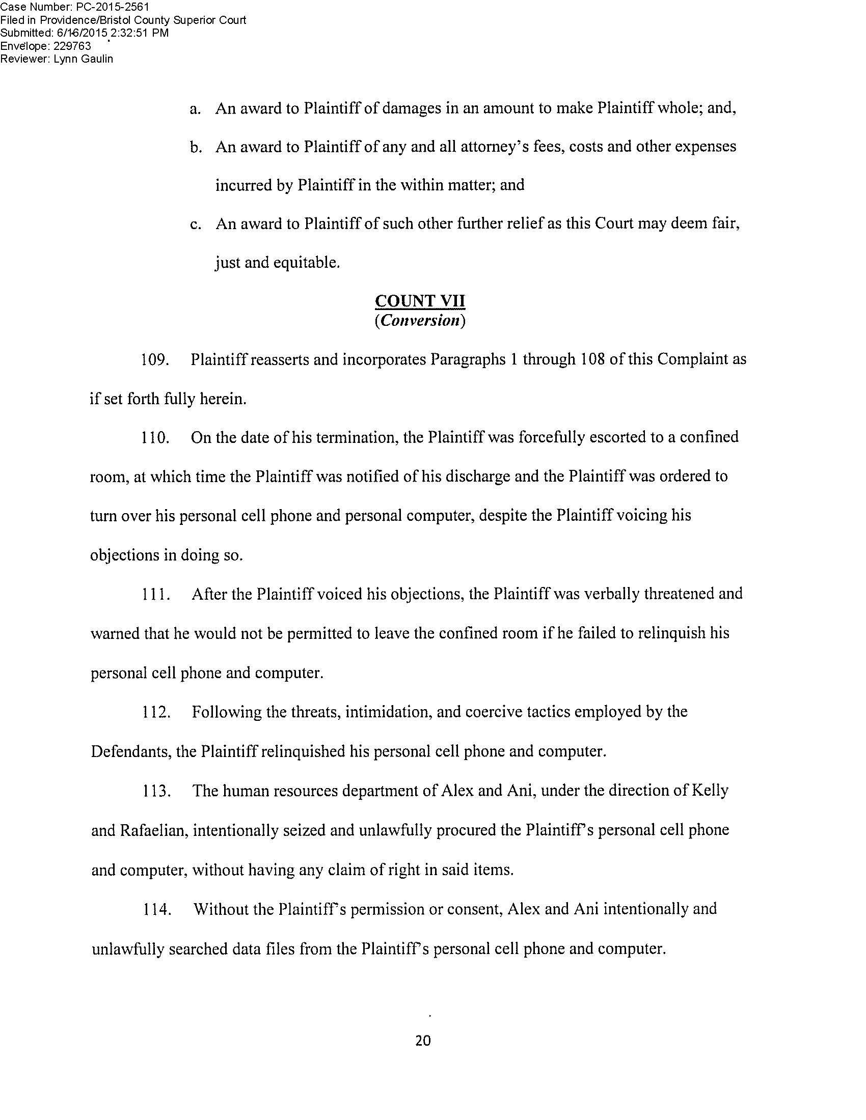 Of notable concern was the fact that Rafaelian directed Seven Swords employees to disregard or otherwise destroy invoices for work performed on behalf of Rafaelian’s personal ventures. Plaintiff had previously complained to Rafaelian, Feroce and David Rozen, CFO for Alex and Ani, that the provision of services by Seven Swords to Rafaelian for her personal benefit, without compensation to Seven Swords, was draining the finances and resources of Seven Swords.