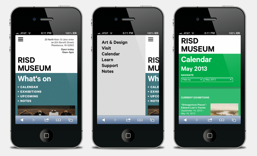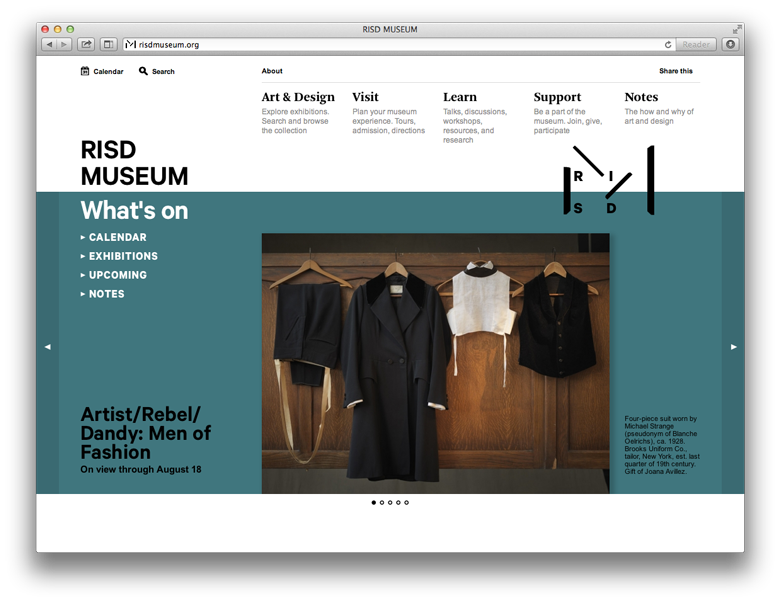 The first website redesign in the Museum's history, risdmuseum.org elaborates these future-oriented values with increased functionality and navigational ease for online visitors. A boldly colored trio of slideshow carousels spotlights the Museum's current and upcoming exhibitions, wide-ranging collection, and unique lineup of programming and resources. Actively engaging in the many ways in which artworks are viewed, experienced, and shared in an increasingly digital age, the site encourages users to expand the conversation and explore works beyond the Museum's walls.