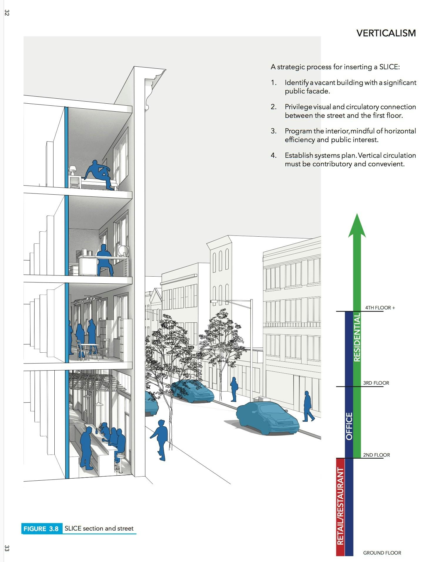Building upon these examples, SLICE deals with a variety of issues from aesthetics to building codes; there are discussions of how this approach creates less expensive real estate, as well as "living billboards for redevelopment of the entire property." In other words, The Inhabited Facade offers a practical and much needed downtown revitalization tool.