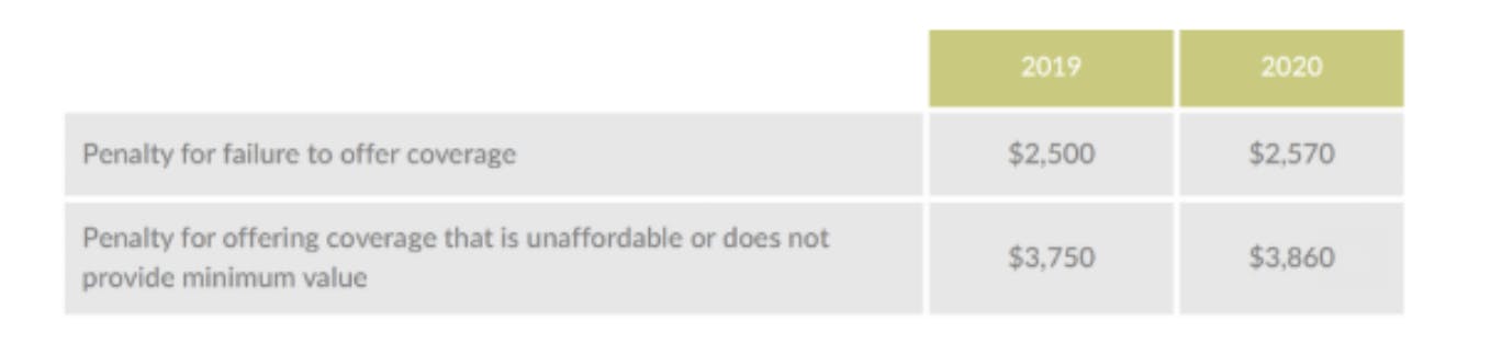 For 2020, the penalty for failure to offer coverage is $2,570 per full-time employee, excluding the first 30 full-time employees. The penalty for offering coverage that is unaffordable or does not provide minimum value is $3,860 per full-time employee who receives a premium tax credit for Exchange coverage.