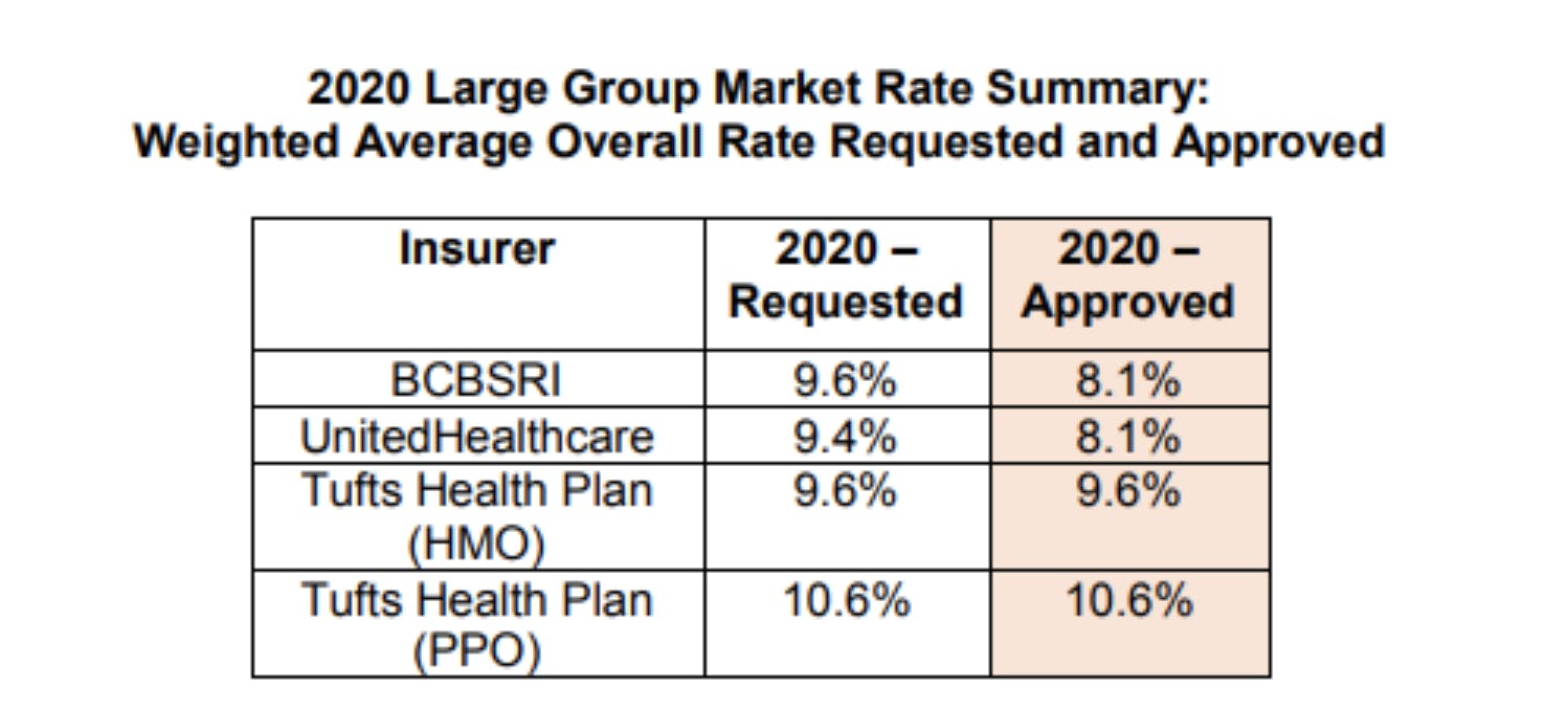 The large group market had the biggest overall rate increases, with the lowest change being 8.1% (United Healthcare and Blue Cross Blue Shield) and the highest increase 10.6% (Tufts Health Plan).