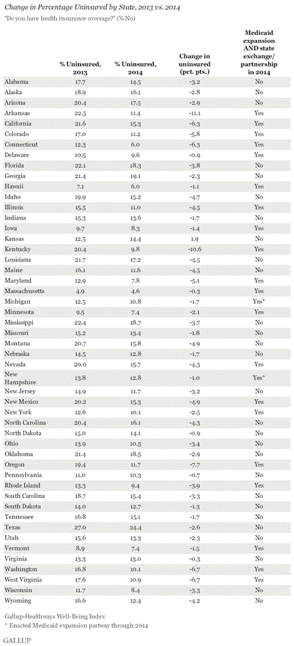 The Gallup survey asked more than 175,000 respondents, "Do you have health insurance coverage?" during the period from January through December 2013 and the same period in 2014. New England residents in Rhode Island, Massachusetts, Connecticut and Vermont reported some of the lowest uninsured rates in the country – with Massachusetts having the lowest uninsured rate in the nation for the seventh consecutive year. Uninsured rates were highest in the South and the West, with Texas claiming the largest number of uninsured for the seventh consecutive year at 24.4%.