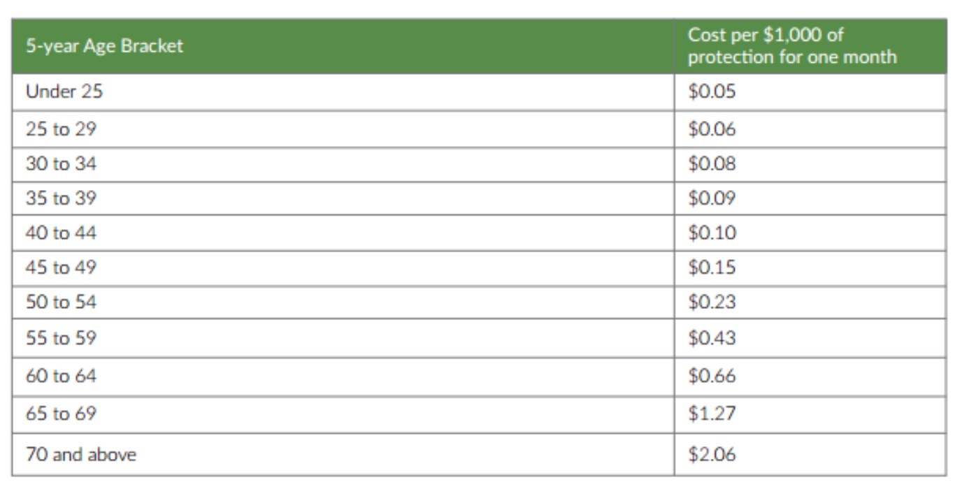 To avoid straddling, insured rates have to be equal to the rates in the following table or all rates have to be higher or lower for each age band. Otherwise, if the plan’s rates are both above and below, employee life insurance from the age bands that have an advantage is considered “carried.” If an employee’s voluntary life insurance is carried, imputed income rules for amounts over $50,000 apply.