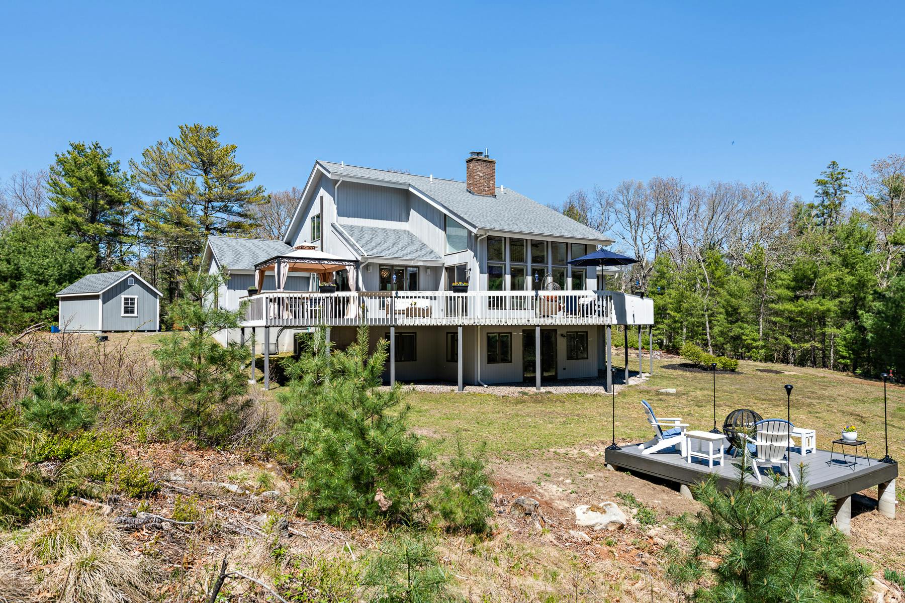 Nestled high on a private drive off of Shannock Road sits this immaculate contemporary-style offering, sited on 2.5 acres of wooded property and located within minutes of several of South County's white sand beaches. Modern in its design and yet organic to the woodsy landscape that surrounds, this 1987 home underwent an insightful and extensive renovation circa 2015 with no stone left unturned. The deck leads to the front entryway, where a stunning eat-in kitchen gives way to a cathedral ceilinged living room with oversized windows and an impressive stone fireplace. Granite countertops, Thermador appliances, marble backsplash, and beadboard ceilings enrich the kitchen and dining area, and hickory floors extend throughout. An expansive deck looks out to the natural landscape, and is accessed from the kitchen, living area, and the master suite. The 1st-floor master enjoys a gorgeous sunroom with skylight and a walk-in California closet, while the master bath offers radiant heated floors, steam shower, soaking tub, and marble/ceramic finishes. Upstairs, two additional bedrooms feature California closets, and a full bath. A walkout lower level offers a game room with gas fireplace, an 8K home theater with Dolby Atmos surround sound, office/ guest bedroom space, kitchenette, full bath, and laundry area. With a two car garage, a 10x16 shed, whole house surround sound and remote home monitoring systems, this home is fully outfitted as both a vacation home and a year-round oasis.