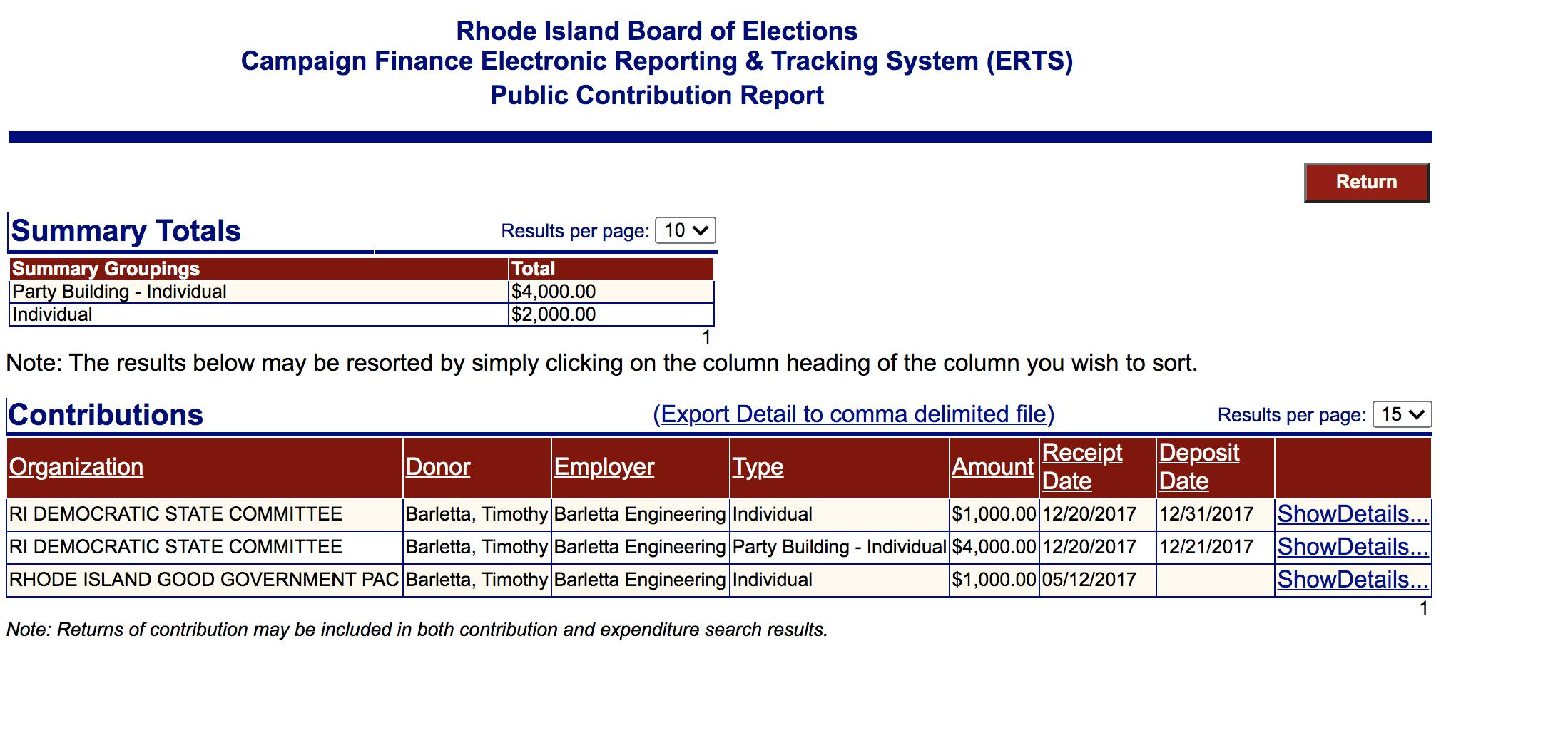 EDITOR'S NOTE: After repeated efforts to reach Barletta Engineering, the company now, via its lawyers, assert that Timothy Barletta is not associated directly with the company and has not been for over 10 years. However, when Timothy Barletta made the political contributions in 2017, he completed a campaign donor card listing his employer as Barletta Engineering. The Board of Election filing is here.