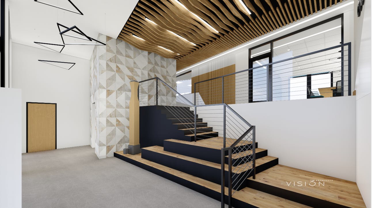 Beyond an entrance canopy supported by massive timbers is a two-story entrance hall featuring a staircase of oak treads, and a wavy wooden ceiling, cleverly composed of live edge horizontal rafters. At the top of the stairs are reception areas, a conference room, and offices. There are wood strips inserted in the ceramic tile floors and different kinds of tiles are used sparingly (there is no cute woodsy-ness, nor any dark wood paneling, as there was in the previous dungeon-like meeting hall). Vision 3’s interior design team has used a muted blue-gray palette, but the overall character is one of abundant natural light. Plus, despite being next to the highway, the building is blissfully quiet.