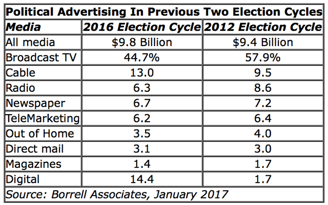 According to research, “Combining local, state, and nationwide election spending, 2016 elections spent $9.8 billion on advertising media, but broadcast TV lost ground, from a 57.9% share of all political advertising in 2012, to a 44.7% share in 2016. Digital media spending, though, increased nearly eight-fold, going from a 1.7% share in 2012 to a 14.4% share in 2016.”