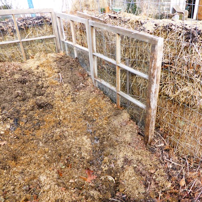 Enormous amounts of leaves, lots of shredded paper, very affordable bales of hay and manure, fun to gather seaweed and much more are available. My colleagues who enjoy fresh tomatoes each summer take a moment to toss their coffee grounds into the green covered bucket I provide. Coffee grounds originate thousands of miles away and bring elements alien and welcome to our soil. I make an effort to protect the heap from the weather by creating barriers to the prevailing northern winds. Currently I use old glass windows found on the sidewalk, 48” wide mesh wire fence and piled bales of hay to form an enclosure about 10’x10’. I make 3 or 4 layers of material although this varies from what is available or abundant. Despite constant additions the heap shrinks and is rarely frozen beyond the most exposed surface.