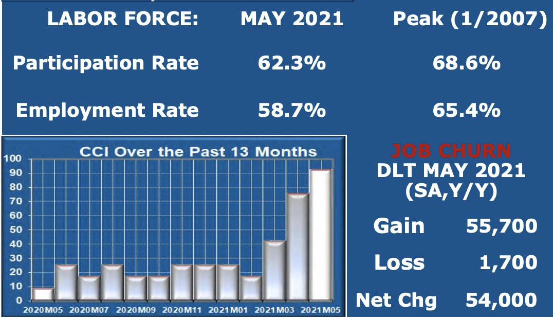 Not surprisingly, these two expansion levels occurred relative to year-earlier CCI levels of 8, which translated into extremely easy “comps.” For a host of the May CCI indicators, they were compared to prior declines of 20 percent or more. As I noted last month, our state’s economy had fallen so far a year ago, it was virtually impossible for it to decline much further, which is how recoveries typically start. In spite of this, a number of indicators have moved well beyond the depths they reached last year, which by itself is encouraging. But as these aggregate values (hopefully) continue to improve in the coming months, we will not be returning to “normal,” as it existed prior to the pandemic.