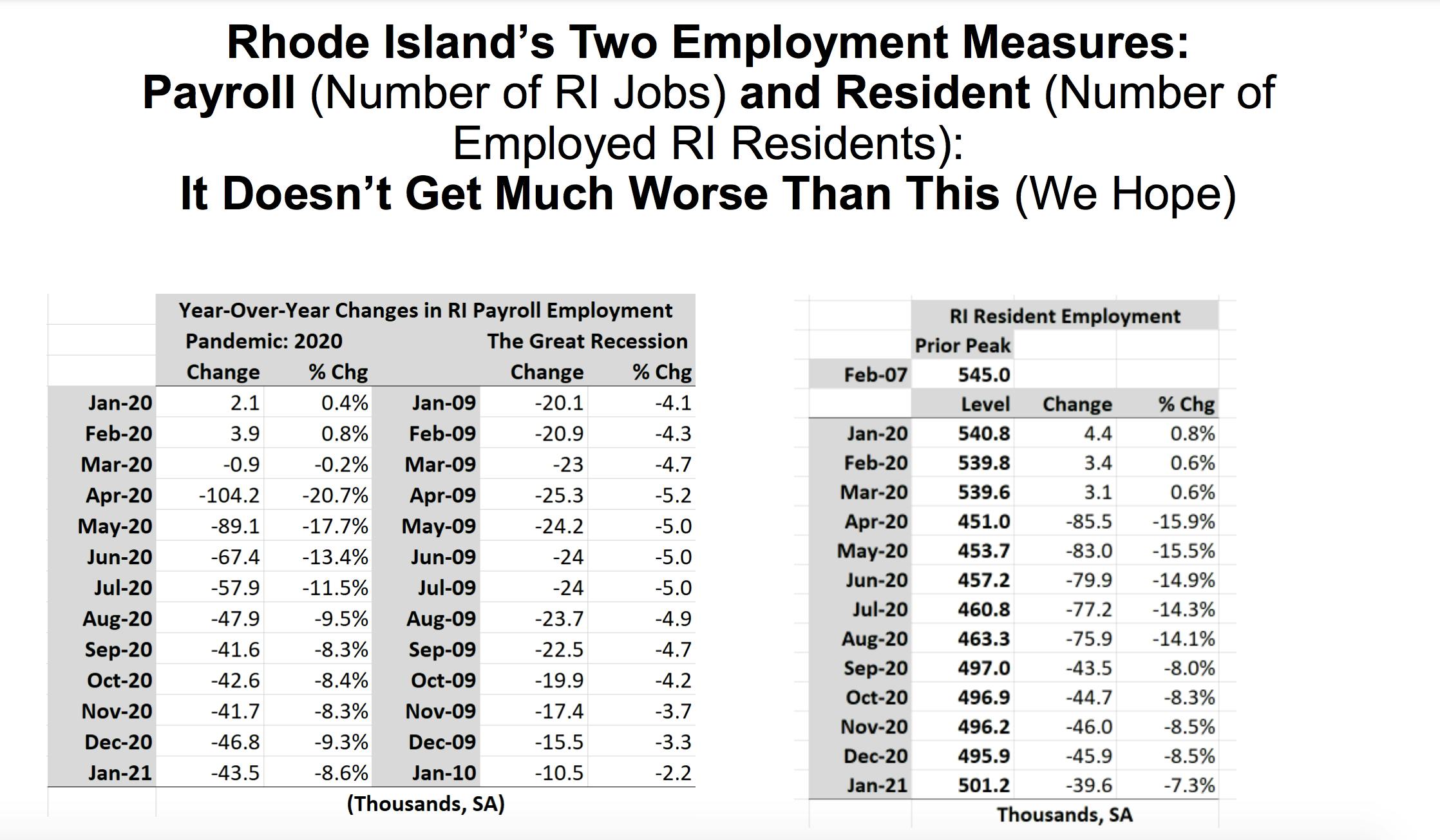 “As we begin to move from the pandemic, it is imperative that we stop striving for “home runs” with large firms. All too often we have either struck out, or as with 38 Studios, gotten hit in the face by the ‘ball.’ Our state’s ability to thrive in this period of recovery will be determined by whether we are able to cast off our image as Rhode Island 5-0. We can begin by setting a goal of returning resident employment back to its prior peak of almost a decade and a half ago! The time is right to shed our modus operandi of Endogenous Mediocrity,” according to Lardaro.