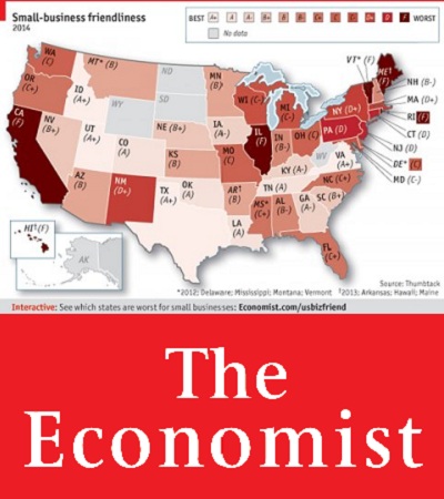 The Economist grades states on an A+ to F grading scale for its small business climate. Rhode Island is one of just 6 states to earn an "F" grade.
