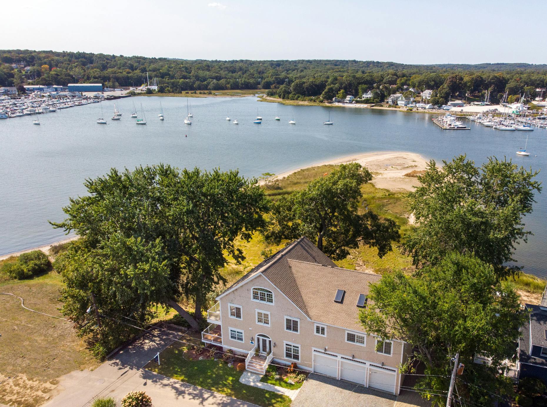 Set your sights on this outstanding architecturally designed waterfront residence, including a private estuary and 800 feet of private sandy beach on Cedar Tree Point. Relish in magnificent sunsets and water views from four levels of living space facing south and westerly, that span across four marinas. The 172 feet of deck on two levels have tempered glass railings. A dramatic entry foyer opens up to three levels and steps into the open great room and dining room featuring Teragren Bamboo floors, Pella Architect & Designer Series windows and 12 sliding glass doors. A well-appointed kitchen with breakfast bar overlooks the living space.
