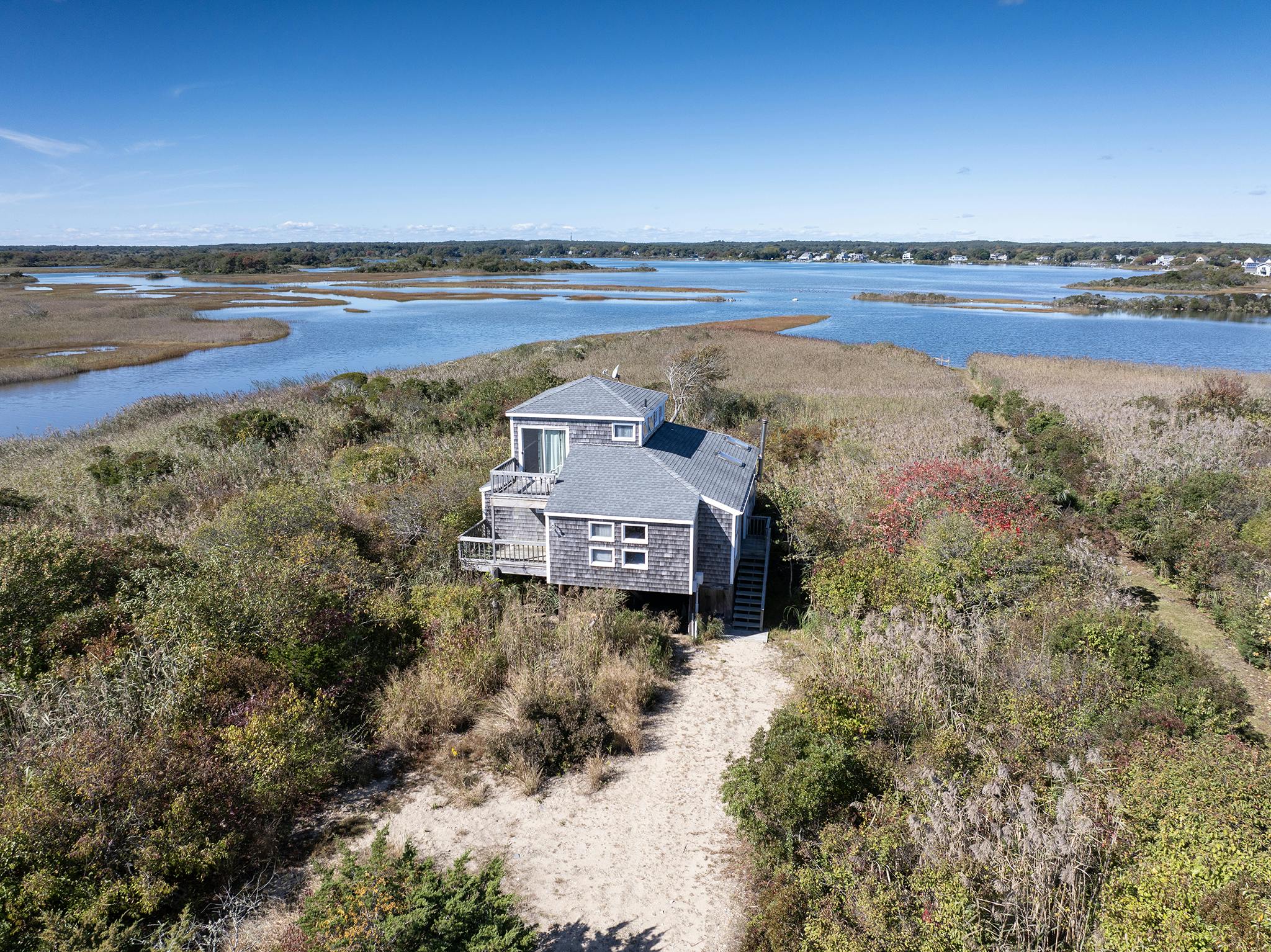 Expansive views! RISD architect William Connell designed a 1972 quintessential rustic beach cottage thoughtfully set back on a .81 waterfront lot abutting Ninigret Pond; now available for the first time! As you drive up the driveway, a sense of privacy and natural beauty arises. When you enter the property, the two-story family room flows with natural light from the architectural windows and skylights throughout. Come sit on the wooden built- in seating to read, decompress and just gaze across the pond. The original knotty pine walls and floors fill the space with a classic New England ambiance. The two or three-bedroom, one-bathroom charming retreat offers an updated 2019 kitchen with classic white cabinets and quartz countertops. Step out onto one of four decks which encapsulate the sounds, sights, and scents of the sea. As you gaze across the unobstructed, unspoiled landscape blending into Ninigret Pond, the salt air fills your body, and unmatched views fill your vision. Evening sunset casts hues of colors on the pond. Enjoy one of the front decks to watch the morning sunrise glisten over Block Island Sound. Deeded easement rights to walk onto and enjoy the coveted pristine beach; affording beach strolls, fishing, swimming, and coastal enjoyment. This lifetime opportunity property offers a new owner numerous possibilities for the future, restoring and using the nostalgia cottage or possible new construction within a highly private .81 lot, with unobstructed views and endless potential.
