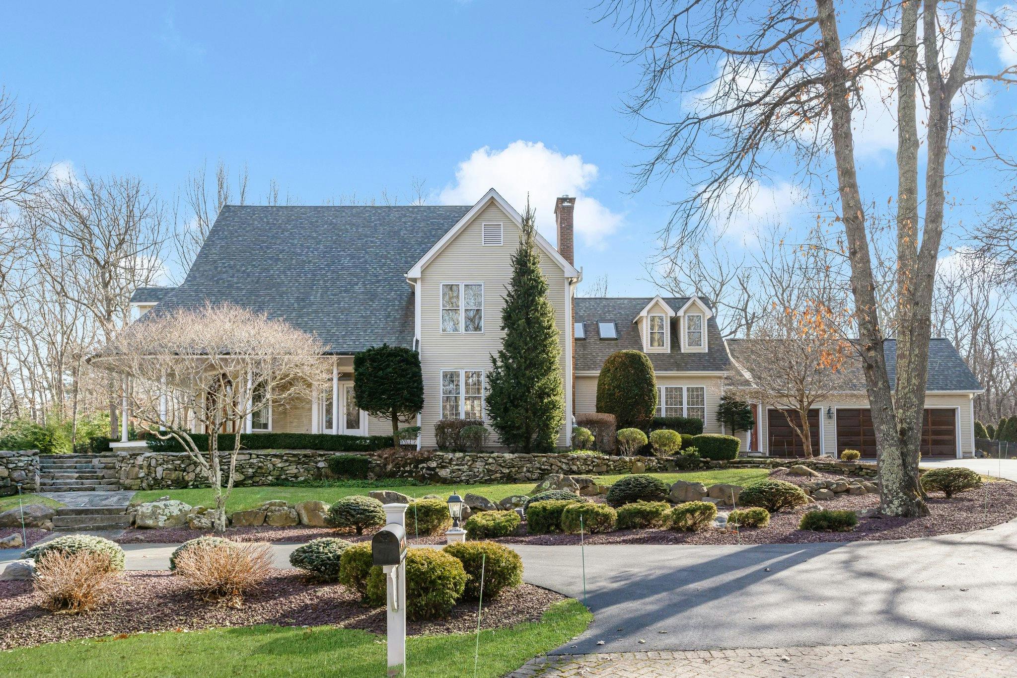 Welcome to 2 Tipping Rock Drive, an impeccably maintained East Greenwich residence situated on over three acres. This property features a Pebble Tec heated gunite pool, a new six-year roof with a 50-year warranty, an updated Navien gas heating system, and Central A/C. Architectural finesse graces every corner, with French doors opening to the mahogany wrap-around porch, a formal dining room leading to a stone patio, and a sunlit kitchen with granite, a Sub Zero fridge, and a breakfast area overlooking lush landscapes. The family room boasts birchwood paneling, built-ins, and a gas fireplace, while the living room includes a wet bar perfect for entertaining. The primary suite offers cathedral ceilings, a gas fireplace, a renovated bath, ample closet space with built-ins and a home office. Two bedrooms and another full bath complete the second floor. The lower level features a rec room, a family room with a wet bar, a bedroom, a full bathroom, a cedar closet, and a gym with walkout access to the lower-level patio. Ample storage, a mudroom, and a three-car garage add convenience. With a new driveway, new well pump, irrigation system and whole house generator, this property epitomizes luxury living, minutes from East Greenwich amenities.