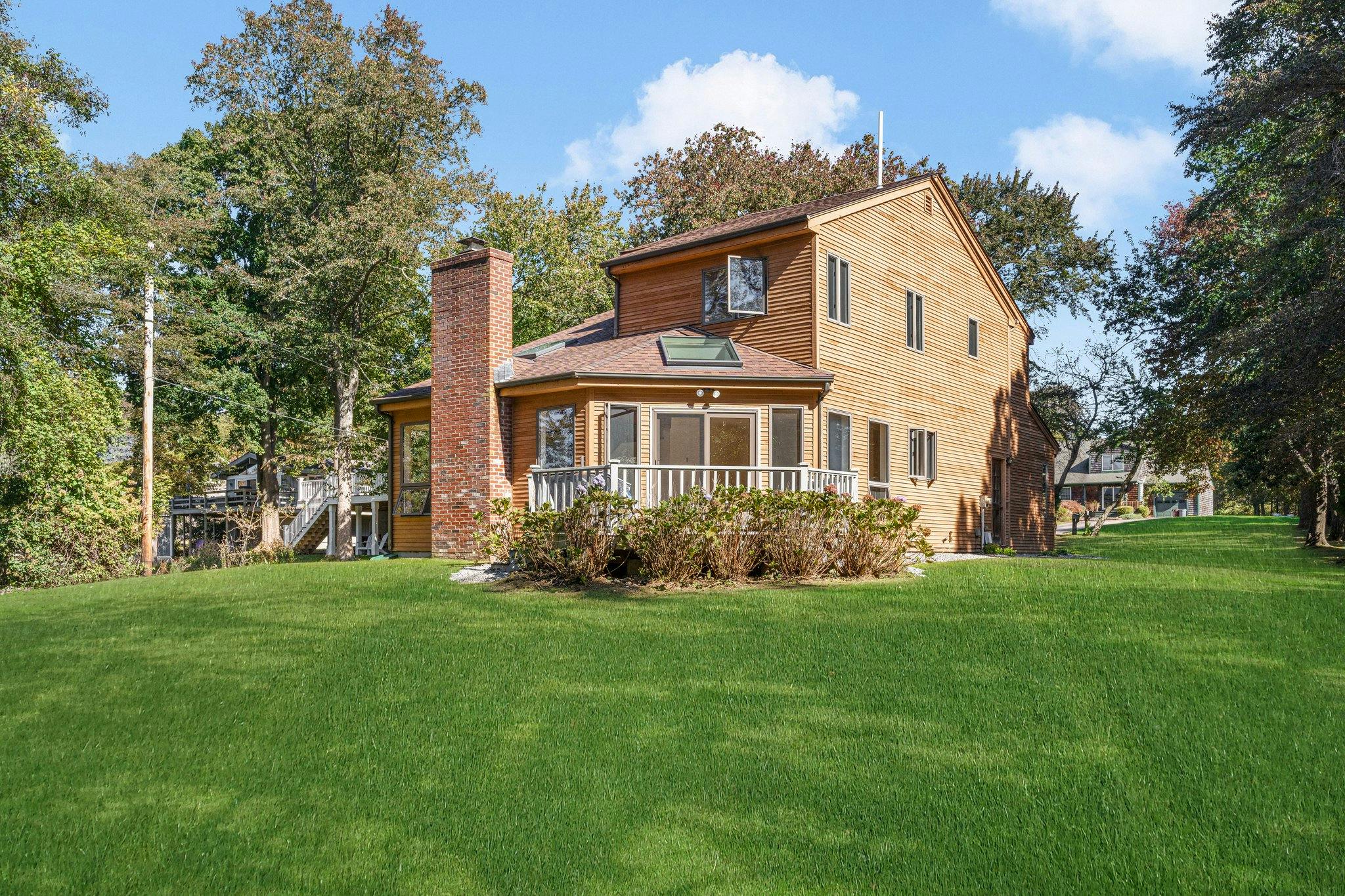 This distinctive waterfront Great Island home was designed to have a natural comfortable feel and to take best advantage of the sun, its light and its reflection on the water with windows strategically placed to offer expansive views from every room. You will find an interior with a contemporary flair and a flexible, open layout. The clean lines and streamlined feel of the home do not hide its quality and craftsmanship including its Italian Valcucine kitchen with Crystalite countertops and high-end appliances, maple hardwood floors throughout, marble floors in the baths. The second-floor primary suite was designed as a private oasis with windows on east and west sides to catch the sunrise and sunset on the water, its own private deck and an office. The exterior boasts Garapa Brazilian wood decking, 50-year roof, lovely plantings, and 126 feet on the pond with its own hideaway and deck. The neighborhood beach is just steps away where you can find mussels and clams and enjoy water activities on the Great Salt Pond. This is a unique and special property for a Buyer who wants to enjoy a home that peacefully complements and blends the inside with nature's beauty all around.