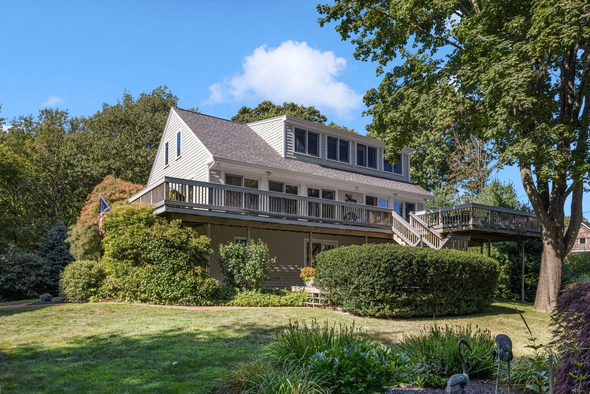 Custom-built contemporary in the coveted Arnolda Association. You will immediately sense the serenity, beauty, and privacy that the expansive 1.57-acre lot offers. A brick walkway directs you to the 3 or 4 bedrooms and two- and one-half bathrooms with three levels of coastal versatile living. The main floor invites a sun-soaked open concept, effortless flow for gatherings between the dining, living, and updated kitchen; wide plank pine flooring, classic white beadboard cabinets, and granite countertop. The primary ensuite has a cathedral ceiling and remodeled stylish bathrooms. Updated Andersen windows and slider doors illuminate the natural light throughout the home. The top floor boasts a fabulous open living space, suggesting possible sleeping quarters, home office, and/or recreation room for relaxation with a view. The first floor completes the home with the two additional bedrooms, full bathroom, family room with 2-walk outs. The home is enwrapped with expansive carefree Trek decking to barbecue, enjoy the summer air. New roof (2019), exterior painting, central A/C, outdoor shower. Arnolda association five docks, total sixteen slips. Take a stroll throughout the tree lined neighborhood, play tennis/pickle ball, and hop on your boat to the association beach while soaking in the beauty of Ninigret Pond! Easy access to route 1 for south county coastal beaches, famed restaurants, and wildlife refuges to name a few!