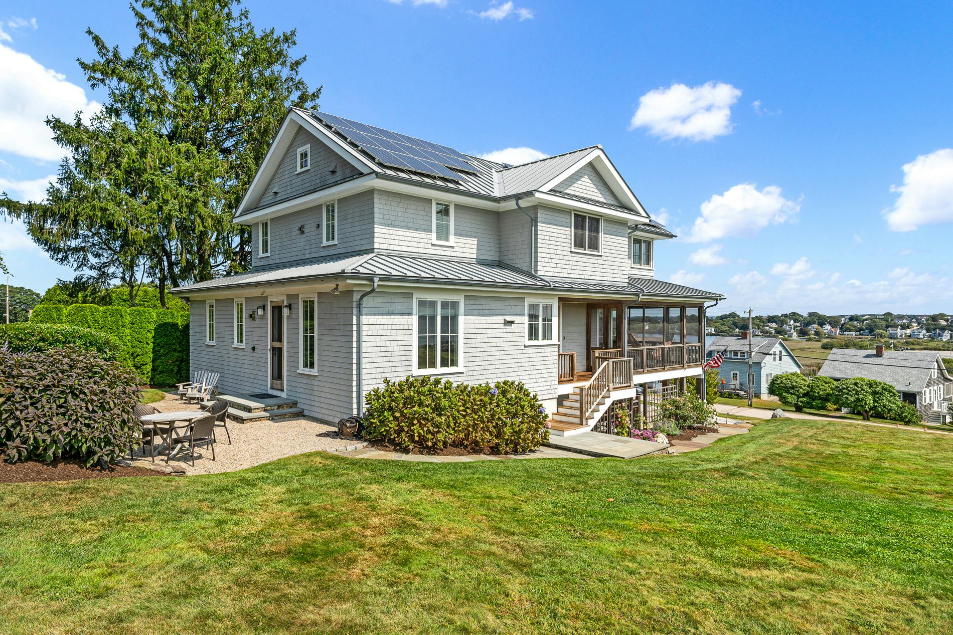 Experience breathtaking views and coastal living at its finest in this thoughtfully designed 4 four bedrooms, three and one half bathrooms beachside home. Built in 2007, this home features geothermal heat and solar panels that make running this home incredibly efficient. Located just 600 steps from the beautiful Wequague Association Beach, this move-in ready home is the perfect blend of luxury and comfort. A well-appointed chefs kitchen is open to the living area which makes entertaining a dream. The living area with French doors open to the expansive screened-in porch, offering serene views of the ocean creating a perfect spot for morning coffee, evening relaxation or a large family dinner. Upstairs the primary suite has a walk-in closet and an exquisite bath with a soaking tub. The landscaped back patio is an outdoor oasis, perfect for grilling or dining with family and friends. And the lower level has a large two-car garage, laundry area, exercise area, wine refrigerator, and extra storage space. You truly do not need to do a thing in this home except bring your family and flip-flops and start enjoying the coveted Narragansett lifestyle.