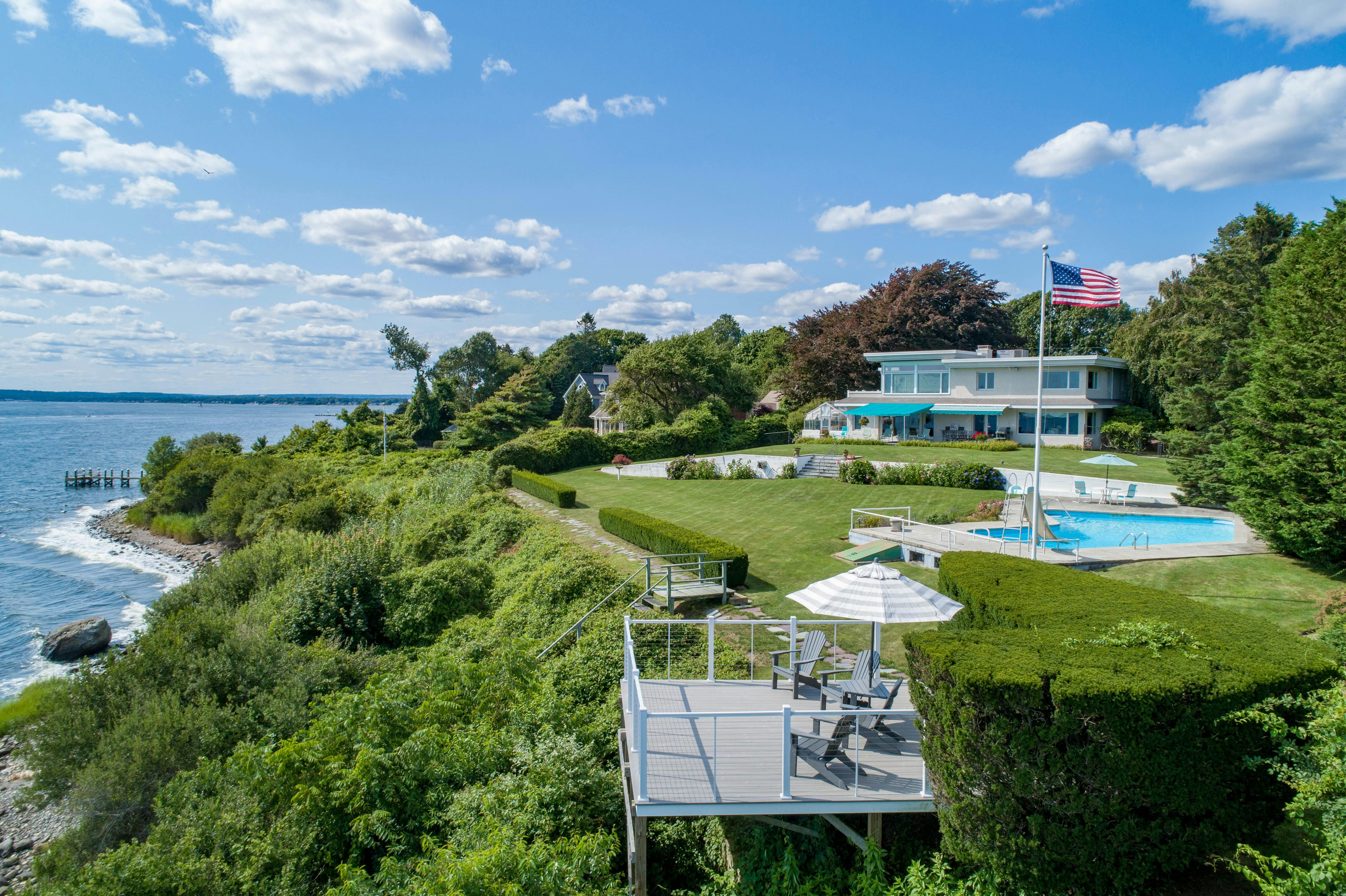 On Point and steps to the beach! Astounding Waterfront Contemporary is situated on 1.24 acres with panoramic vistas of Narragansett Bay, spanning direct views of the Jamestown and Newport Bridges as well as Patience and Prudence Islands. Dine al fresco on the bluestone patios, lounge poolside or retreat to the amazing overlook deck by the water's edge! Impeccably landscaped grounds welcome you at the circular drive with ample parking and a 4 car garage. The home features solid construction and fastidious attention to detail at every turn. A spacious floor plan with glass doors to the outside, invites an easy flow from the kitchen, dining, and large family room with gas fireplace. First-floor ensuite bedroom with a walk-in closet and spa-style bath. Upstairs you will be transported to another world in the primary suite, with two gas fireplaces, a sun/sitting room with oversized windows and endless views that continue outside on the private veranda. Two additional rooms, a room-sized landing a half bath and laundry. Fully equipped guest quarters have a separate entrance with two large versatile rooms, a recently renovated full bathroom, a separate laundry area and it's own private veranda with breathtaking water views. For those with a green thumb or studio needs the Greenhouse has heat, A/C, as well as climate-controlled louvres. Many recent upgrades include a 2014 Septic System, 2017 New Roof, 2020 Generator, Dryvit system exterior. 10 minutes to TF Green, minutes to golf and marinas.