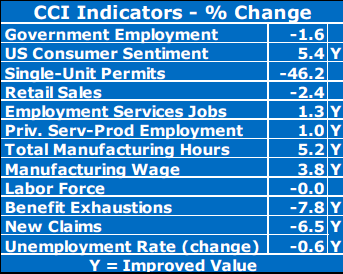 Ultimately, its trend will be a critical determinant of future improvements in the Current Condition Index. The last improving indicator, Benefit Exhaustions, which reflects long-term unemployment, declined by 7.8 percent in February. Retail Sales fell in by 2.4 percent in February, while Government Employment declined by 1.6 percent. Single- Unit Permits, as stated earlier, fell 46.2%. Finally, RI's Labor Force was unchanged in February, which for calculation purposes, means it also failed to improve.
