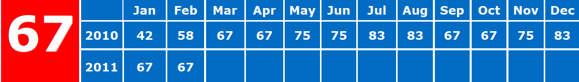 The February Current Conditions Index value, 67, means that eight of the 12 indicators improved compared to their values one year ago. Particularly noteworthy this month was the fact that several indicators improved in spite of very strong “comps” last year.