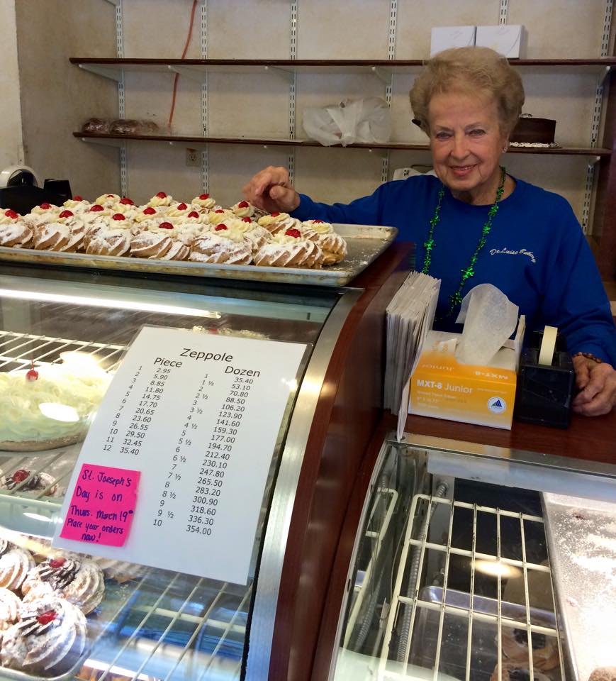 The “Big Boss” Sal has been working hard on those fried zeppoles at DeLuise Bakery, 1251 Chalkstone Ave, Providence. They also offer mini zeppoles at $18 for a dozen. Regular zeppoles are just $2.95 each, and come in a variety of flavors: traditional (cooked yellow cream), chocolate cream, and whipped cream.