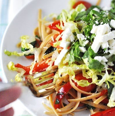 If pasta is a staple in your kitchen, try this dish of pasta topped with salad. Think of it as your entire meal in one bowl! You can use any vegetables of the season, and a good, fresh feta cheese to add some tang.