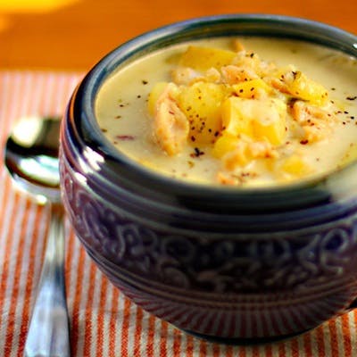 White, red, or clear -- where you come from probably determines your loyalty to one chowder or another. So what's a girl who was born in Manhattan (the home of red chowder), lived for decades in Boston (white chowder), and now spends most of her time in Rhode Island (clear chowder) to do? She’d create her own chowder, the quick and easy kind. I'm partial to white chowders, made with the addition of milk or cream. To enjoy this chowder year-round, we've used canned clams (our local favorites, from Iggy's, the clams we used in Rhode Island Recipes), and bottled clam juice.