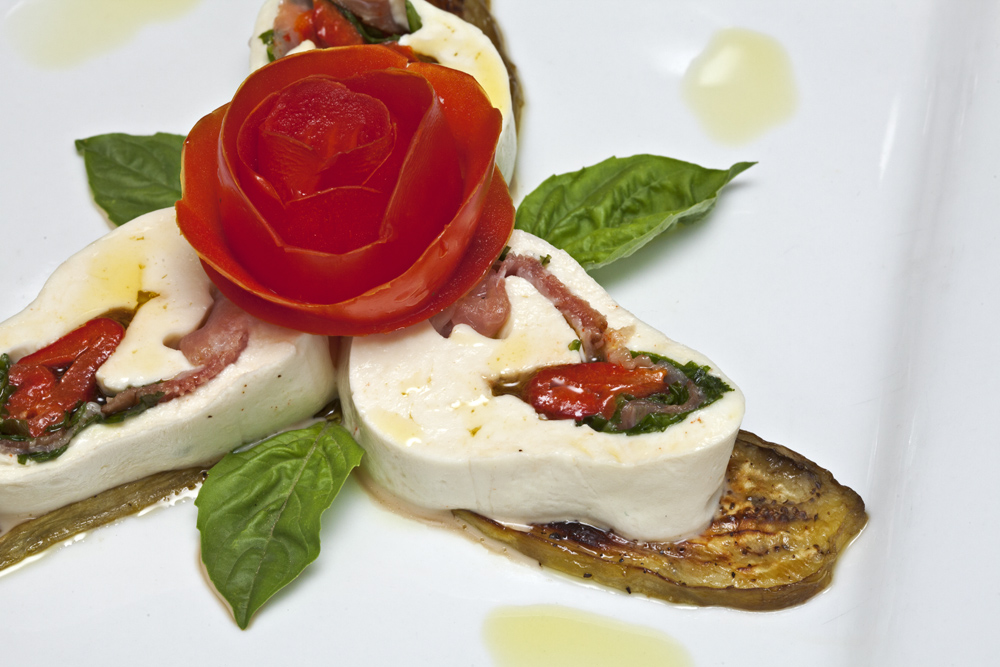 Four. Knowing when to quit: On some things, Chef knows when to quit. Take the precision in cook times in this busy kitchen, yielding a soft, perfectly medium rare seared scallop plated with grilled artichoke hearts in the Capesante e Carciofi Grigliati appetizer, or a brawny veal chop passed through the broiler and right to my table. And yet... Chef, please apply this sense of decorum to presentation (a heavy-handed tomato rose overwhelms an otherwise delicious appetizer of stuffed mozarella, left). And with the sides... a whipped, piped potato? In Tuscan cuisine? The only place I want to see a piped mashed potato is a wedding in 1987; save your star tip for meringue.