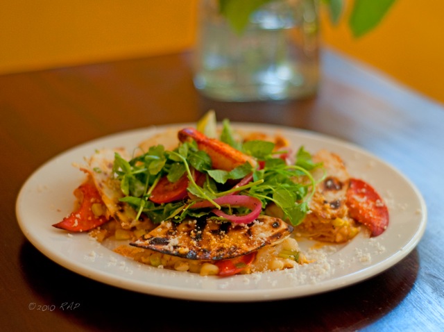 Perfectly sautéed seasonal vegetables (squash, onions and peppers) provide the bed for this faultlessly charred corn. Crispy, aromatic and stunning, this plate conjures images of a fabulous Mexican