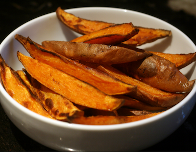 - In a large bowl, toss the Sweet Potato wedges in Maple Syrup (ONLY 1 tablespoon), Salt & Pepper.