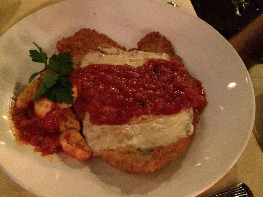 The veal is Sautéed, Milk-Fed Scaloppine, Lightly Breaded, Provolone, Marinara, House-Made Ricotta Gnocchi