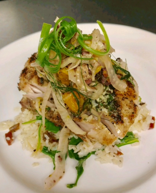- Grilled Local Striper – orange-fennel-olive salad, green + red flecked jasmine rice