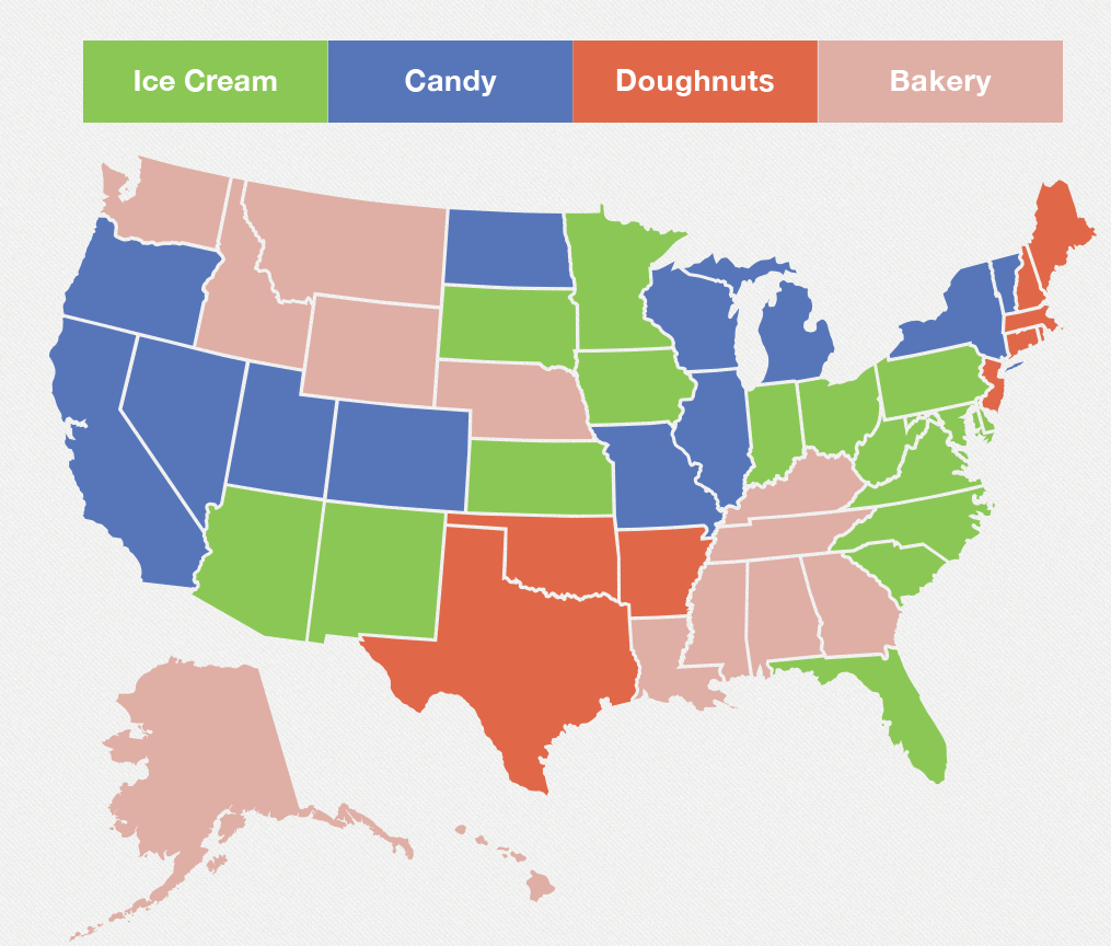 The charts below show the most popular sweet tooth category in each state and how each category stacks up in Rhode Island.