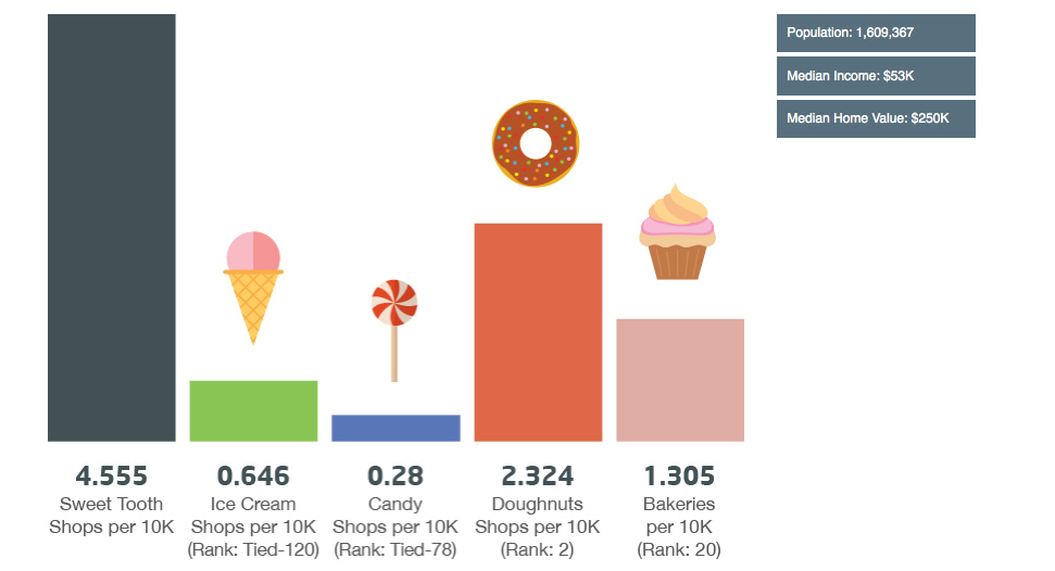 To find out which cities had the largest sweet tooth, Infogroup used its verified business database of over 17 million records to measure the number of "sweet" retailers per city.