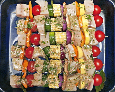 2. Assemble skewers as shown in photo, or a variation you like, setting as shown in a large baking dish. Pour vinaigrette over all pieces and allow to marinate for 2-3 hours, turning occasionally, in refrigerator.