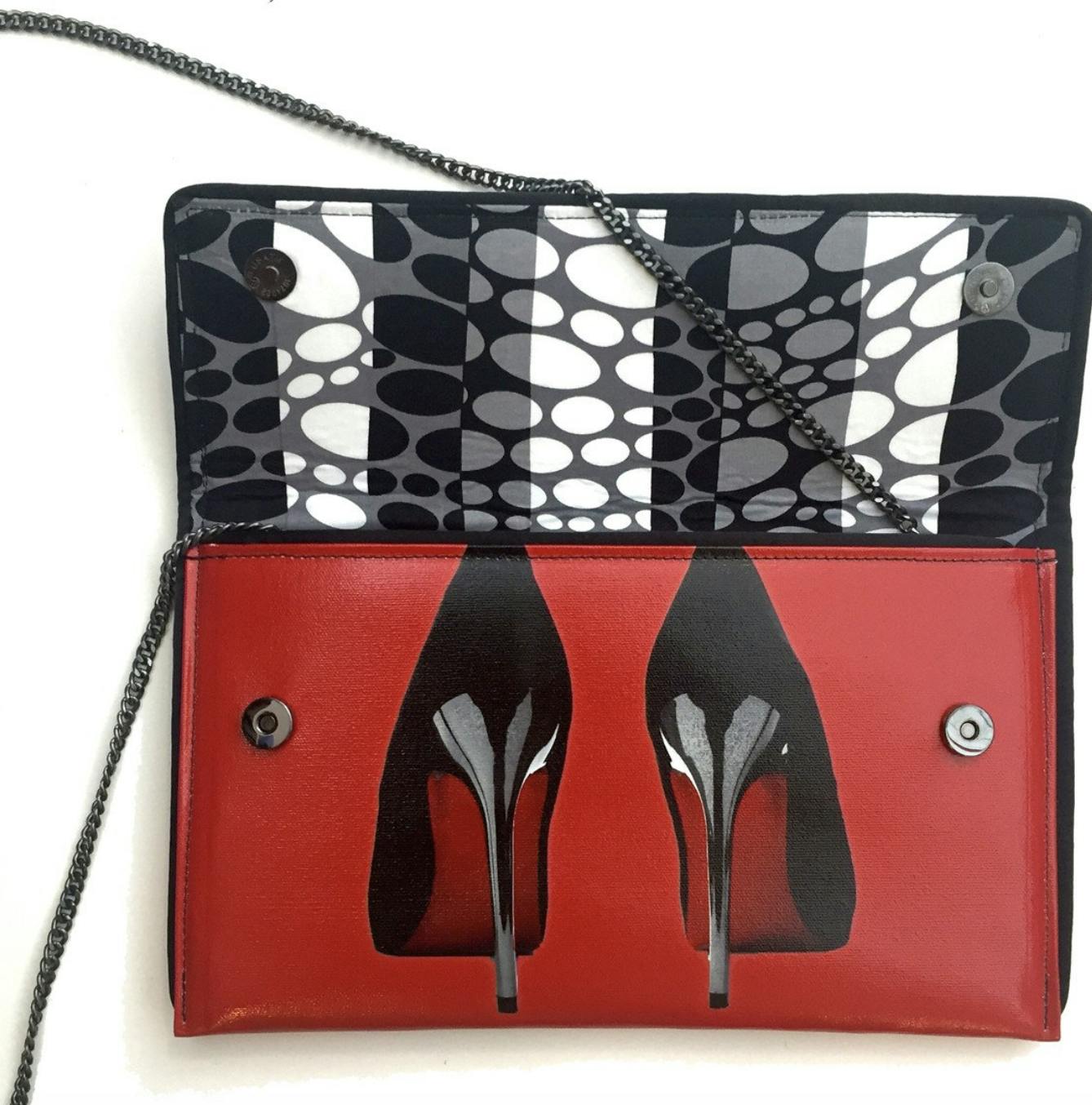 "Paint the town red. Featuring red bottom shoes, this asymmetrical clutch is hand crafted to perfection. All bags come with a removable cross-body chain, logo dust bag, clear vinyl inner pocket and are individually signed. Inside fabric may differ from what is pictured. Price includes shipping," said Stetson on his website.