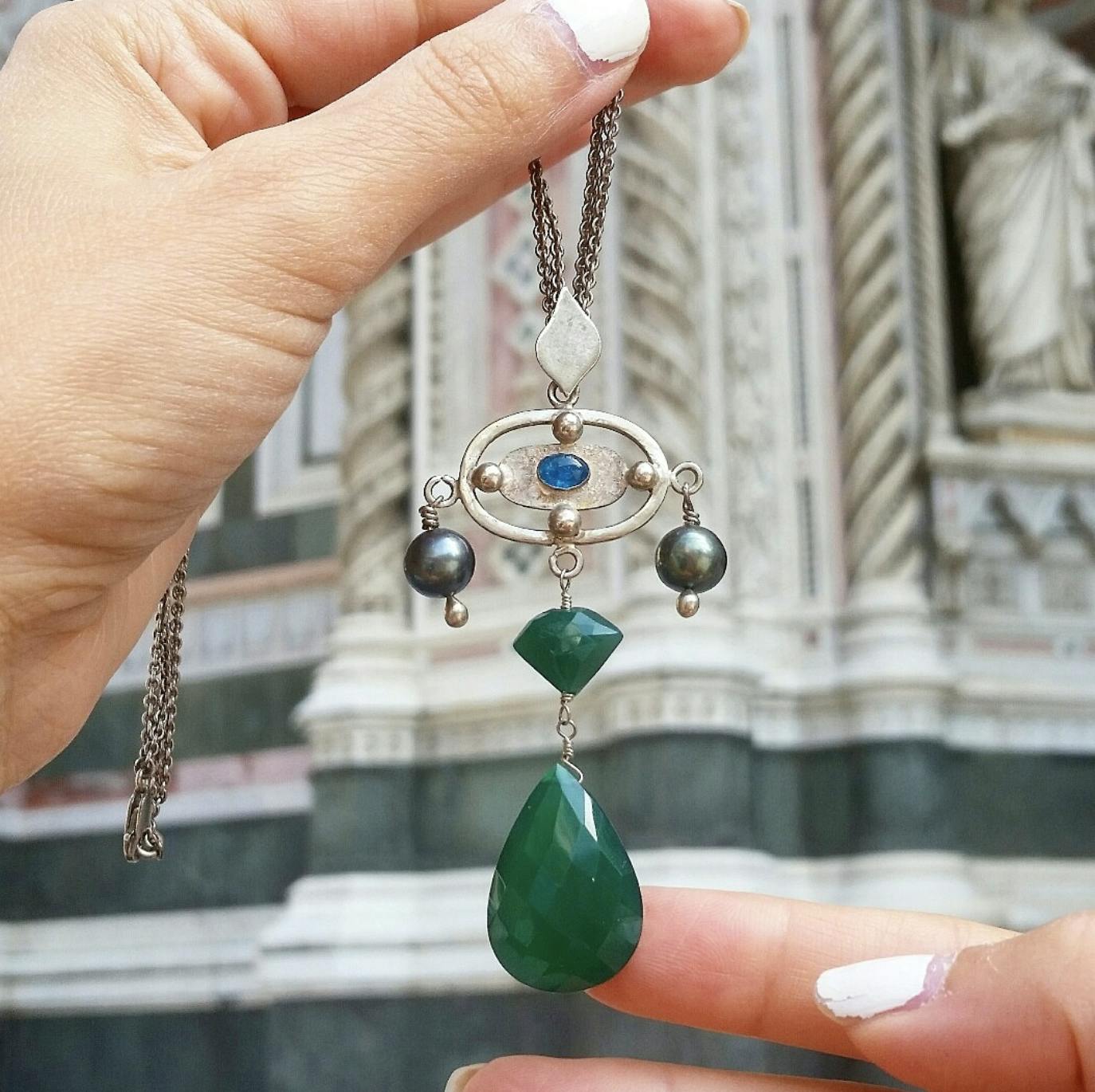 Entirely Hand fabricated in Recycled Sterling Silver with a bezel set Apatite gemstone, Peacock Pearls, and Green Onyx.