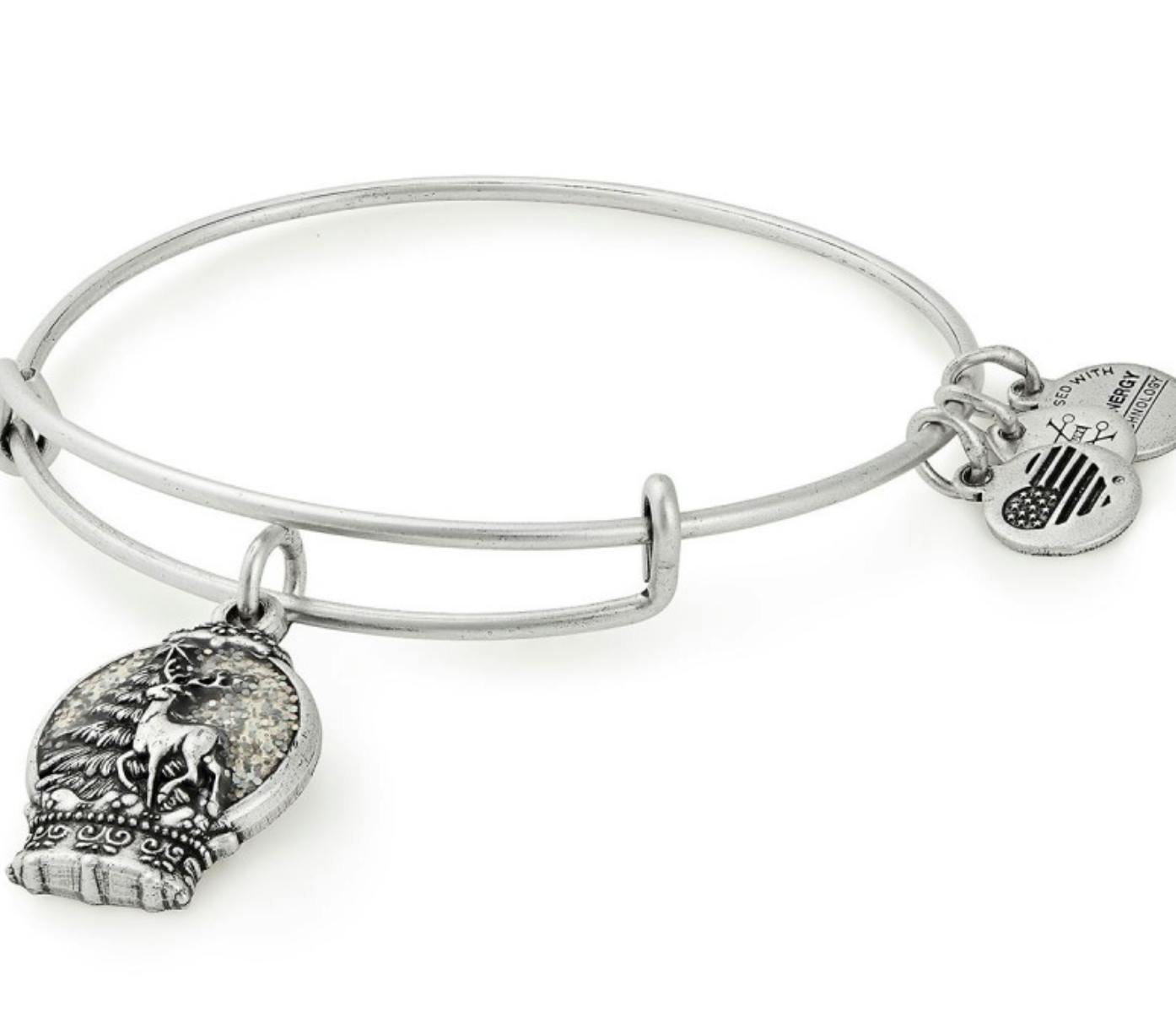 "A snow globe is a festive moment, frozen in time. It evokes nostalgic memories of childhood Christmases past. This Snow Globe expandable wire bangle in RAFAELIAN SILVER Finish is a Black Friday exclusive. It features a glittery snow globe charm with a reindeer and Christmas tree inside, and a dated 2018 tag that commemorates the joy of this particular holiday season," writes Alex & Ani on thier website.