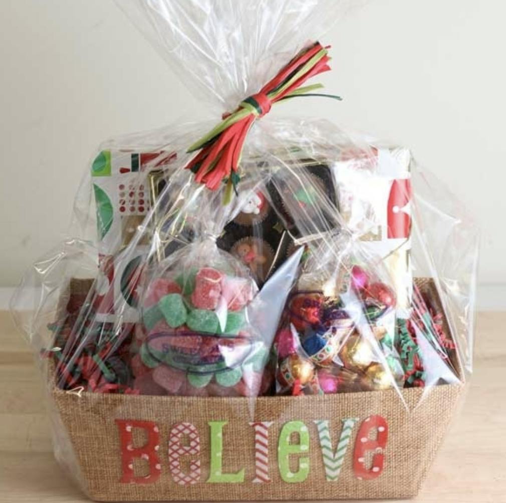 "Our medium rectangle paperboard basket contains 1/2 lb assorted chocolates, 1/2 lb box of panned cranberries, 9 piece decorated chocolates, 1/2 lb bag of reindeer corn or spice drops and 1/4 lb bag of foiled balls," writes Sweenor's on their website.