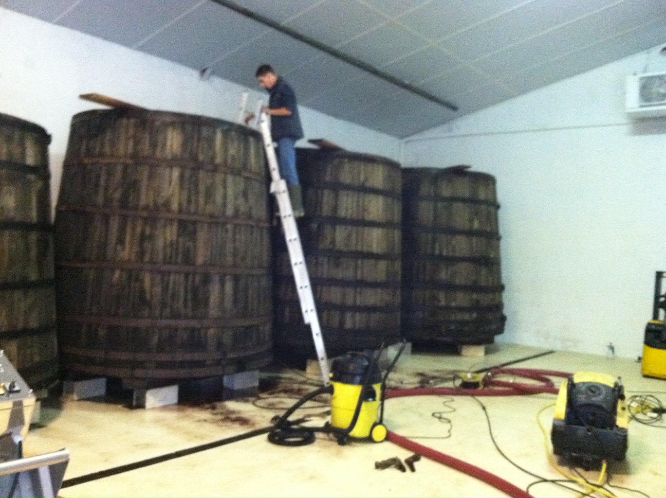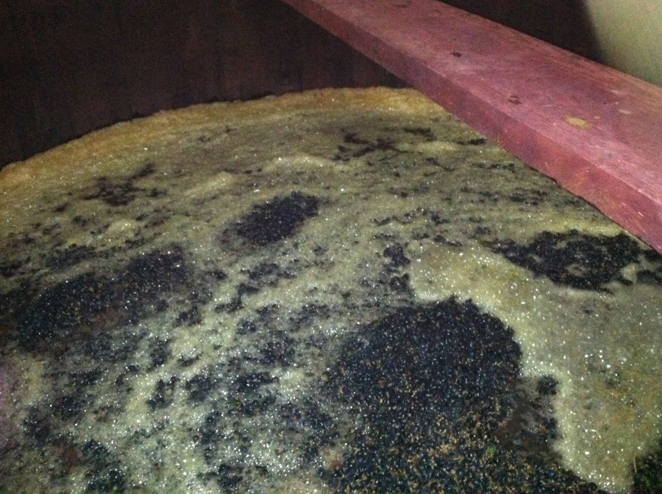Alexis Boucard inspecting the tankThierry doesn’t use commercial yeast in his winemaking, so he has to wait until fermentation starts to occur naturally. The vat that Thierry son Alexis is inspecting is filled with crushed grapes that were harvested yesterday. It normally takes 2-3 days for fermentation to initiate on its own. Once fermentation is over and all the sugars are converted into alcohol (which usually takes 1 week) the juice is left to soak on the skins for an additional 3 weeks. This process (called maceration) is when all the color, flavors and tannins are extracted from the skins and imparted in the juice. All this happens in huge oak vats that are more than 100 years old.