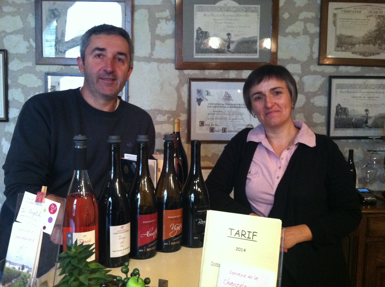 Thierry and Christine BoucardEarly this morning I left Angers and headed east towards the city of Tours. On the way I stopped by Domaine de la Chanteleuserie located just outside of Bourgueil in the village of Benais where I had a 9 o’clock visit with proprietors Thierry and Christine Boucard. The Boucard family has been growing Cabernet Franc in this region since 1822. Today, they make 7 different wines based on this wonderful grape variety; a still Rosé and a sparkling Rosé, as well as 5 red wines ranging in style from light, fresh and lively to rich, powerful and tannic.