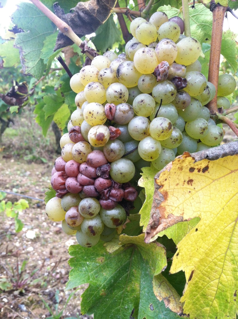 A Chenin Blanc cluster partially infected with botrytisA wine labeled ‘Bonnezeaux’ (pronounced ‘bon-zu’) must be made exclusively from Chenin Blanc. What makes this sweet wine especially interesting is the way it is made as the producer must use late harvested grapes that have been infected with a rot called botrytis. Botrytis is a rot that occurs naturally, but only under very specific climatic conditions - hence in very few places. Basically, what botrytis does is it penetrates the skin of the grape causing the water inside to escape/evaporate. This turns the grape into a sort of raisin on the vine concentrating the sugars in the process. After the grapes have reached optimal levels of ‘botrytis’ the grapes must be harvested by hand.