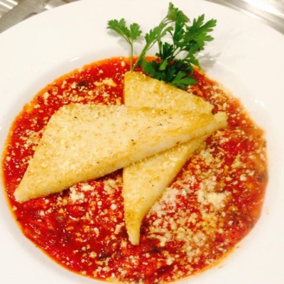 Minestrone Toscano /Vegetable Soup | Insalata al Formaggio/Handmade Parmigiano cheese basket filled with arugala, cherry tomatoes, drizzled with 10 year old balsamic vinaigrette and crumbled gorgonzola cheese | Bruschetta Toscana/Diced tomatoes tossed with basil, extra virgin olive oil and a balsamic reduction, served over baked crostini bread