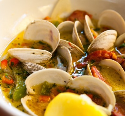 Roasted Pear Salad, Field Greens, Candied Walnuts, Goat’s Cheese, Balsamic Vinaigerette French Onion Soup, Gruyere Cheese Stuffies, Local Quahog With Chourico and Ritz Cracker