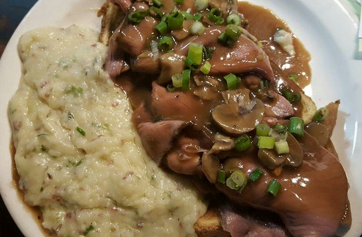 The featured brunch selctions are: Roasted beef hash ($15), PB and J French toast ($13), Two entrée BBQ braised pork sandwich ($14), and peppercorn crusted hangar steak ($29)