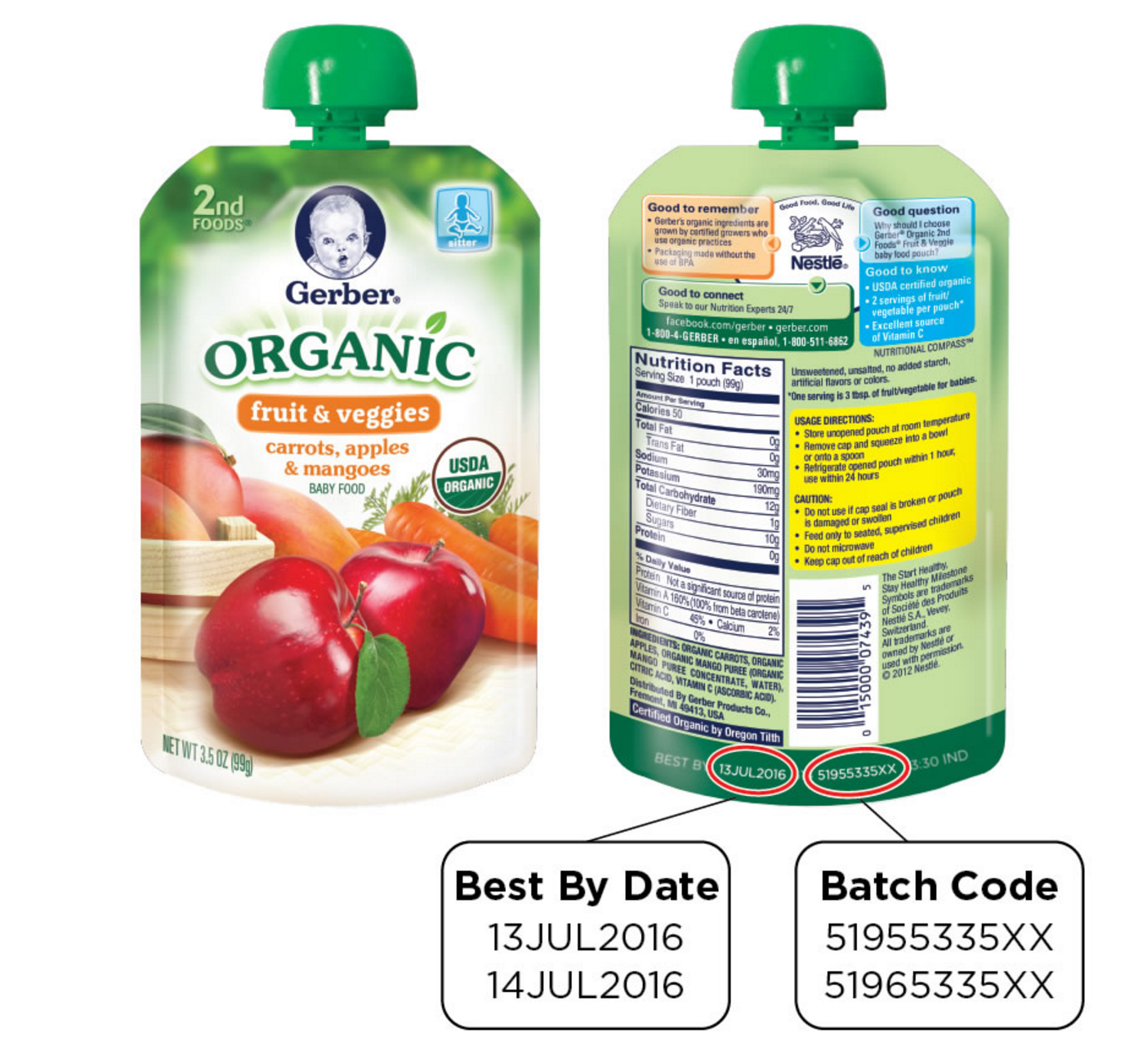 The products were distributed at U.S. retailers nationwide and through on-line stores. Consumers who purchased pouches with the above UPCs, batch codes and expiration dates are encouraged to contact the Gerber Parents Resource Center at 1-800-706-0556 anytime day or night for a replacement coupon.