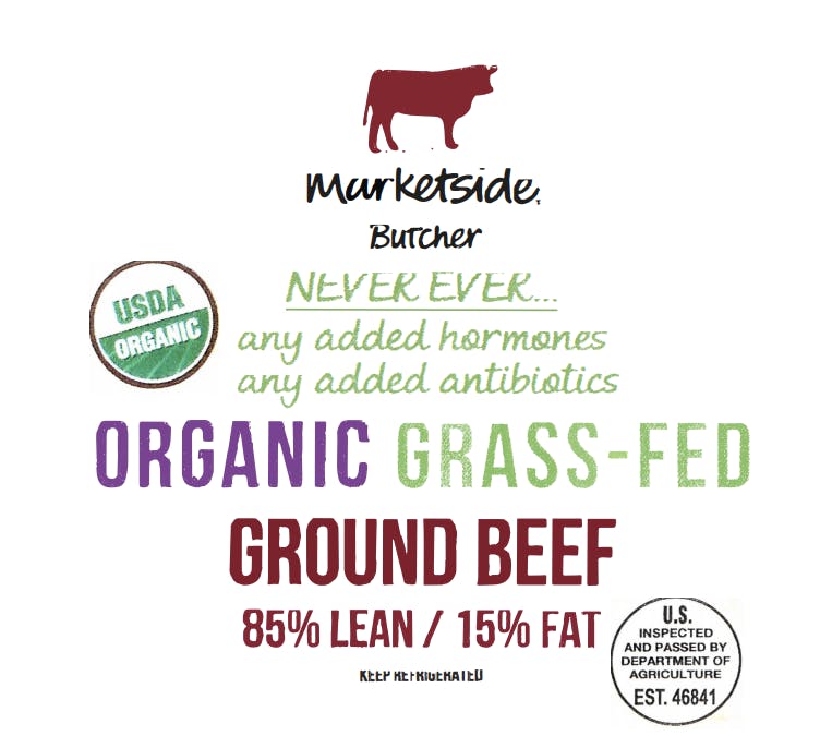 1-lb. vacuum packages containing “MARKETSIDE BUTCHER ORGANIC GRASS-FED GROUND BEEF” and a use or freeze by date of 07/01/20 and lot code P-53298-82.