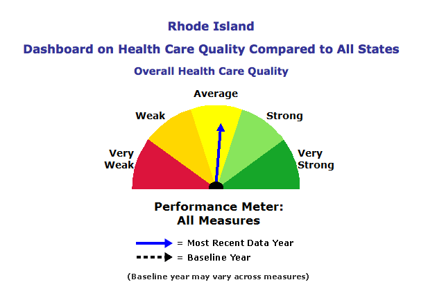 AHRQ's overall healthcare performance meter for Rhode Island shows the Ocean State's arrow solidly in the "average" quadrant. Rhode Island's meter "score" ranked #16 in the US, but at the bottom of the New England states.