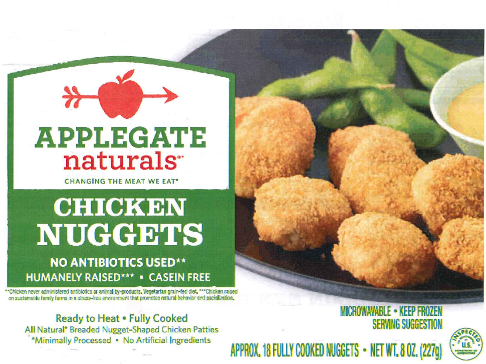 The recall is for 8-oz boxed packages which contain approximately 18 pieces of "Applegate Naturals Chicken Nuggets" with a best before date of 9-27-2016. The products were produced on September 28, 2015.